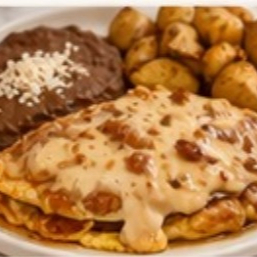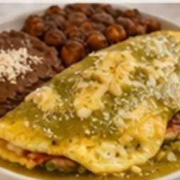 Acompañadosde frijoles regritos, aguacate, toritlla de maiz, de harina o pan.