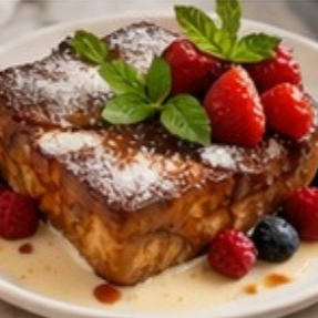 Pan brioche caramelizado, acompañado de frutos rojos y salsa de 3 leches.(1pz)