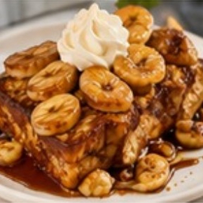Pan brioche caramelizado, acompañado de plátanos flameados con kahlua y crema dulce. (1pz)