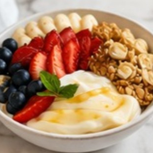 Fruta de temporada, Yogurth griego, granola, miel de abeja.
