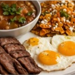 Huevos al gusto (2 pz), acompañados de arrachera 100 gr, papas rusticas al horno, frijoles charros y porcion de chilaquiles en salsa roja o verde
