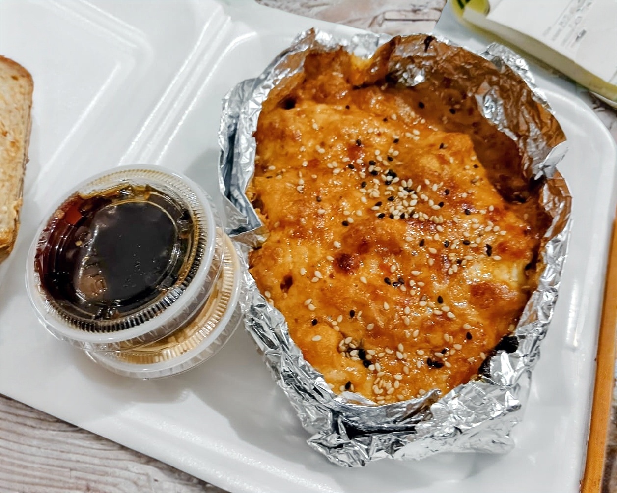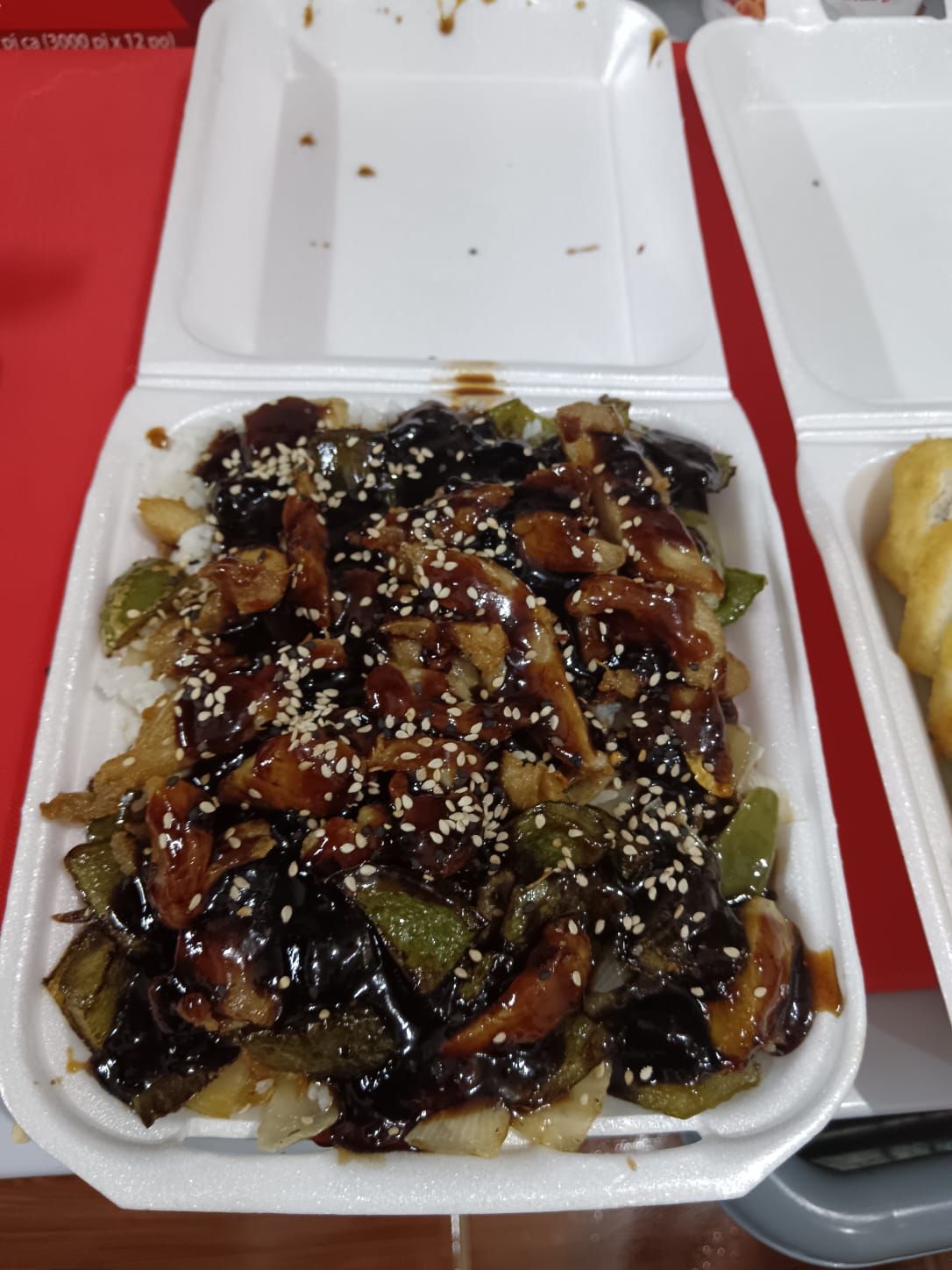 Medio teriyaki de pollo y medio yimi roll.