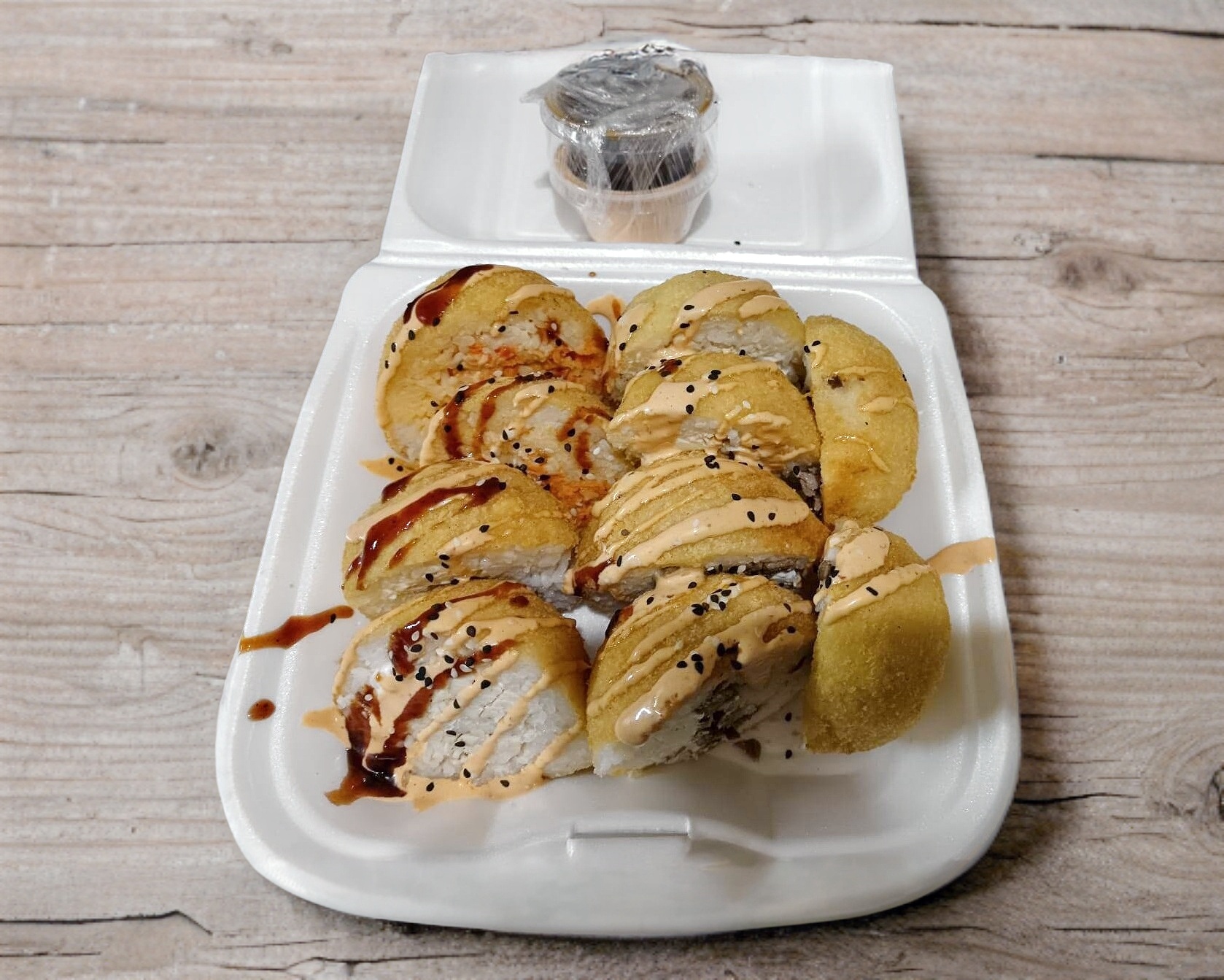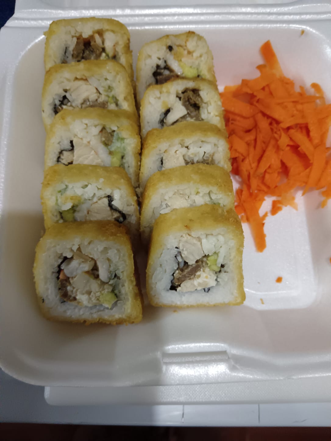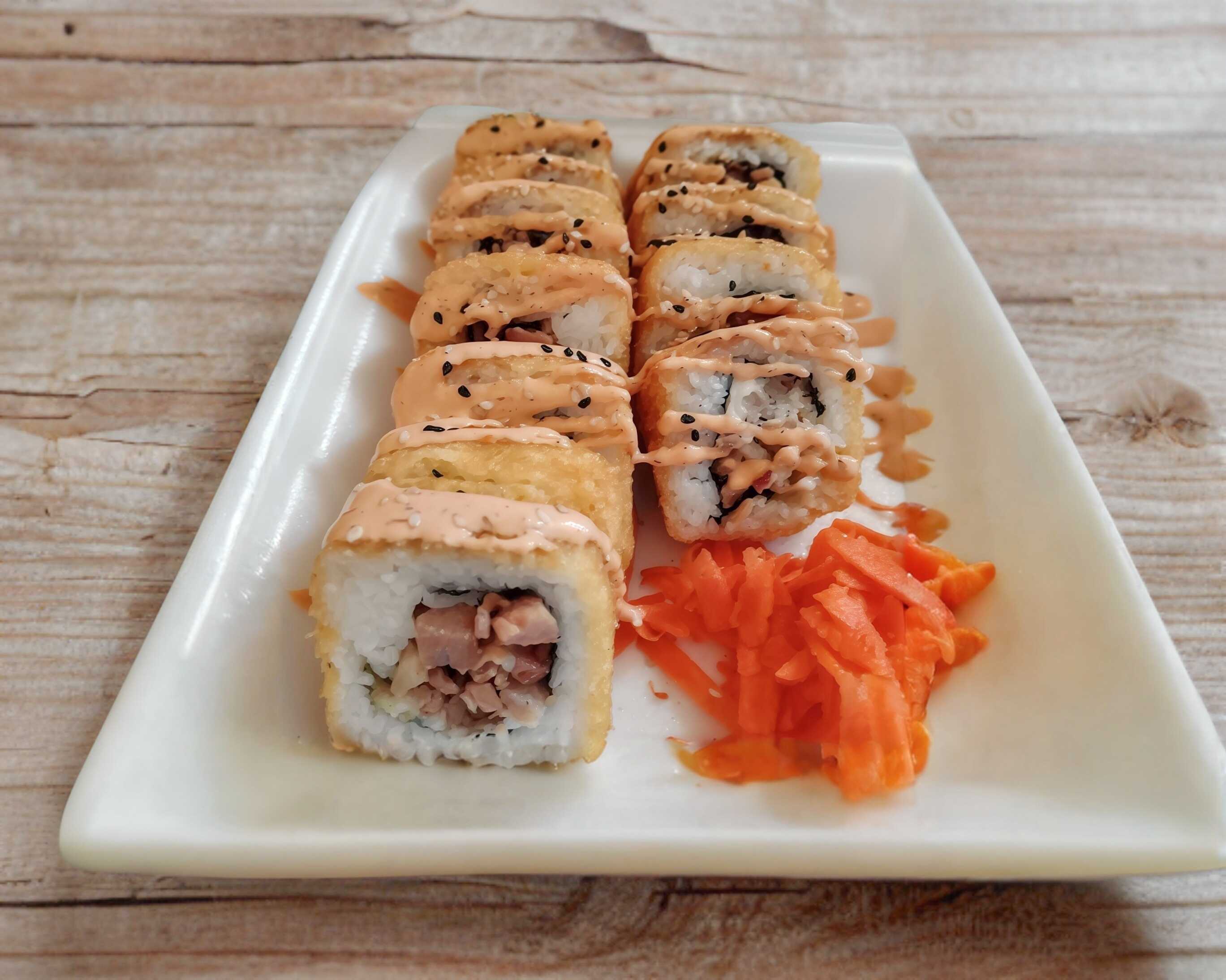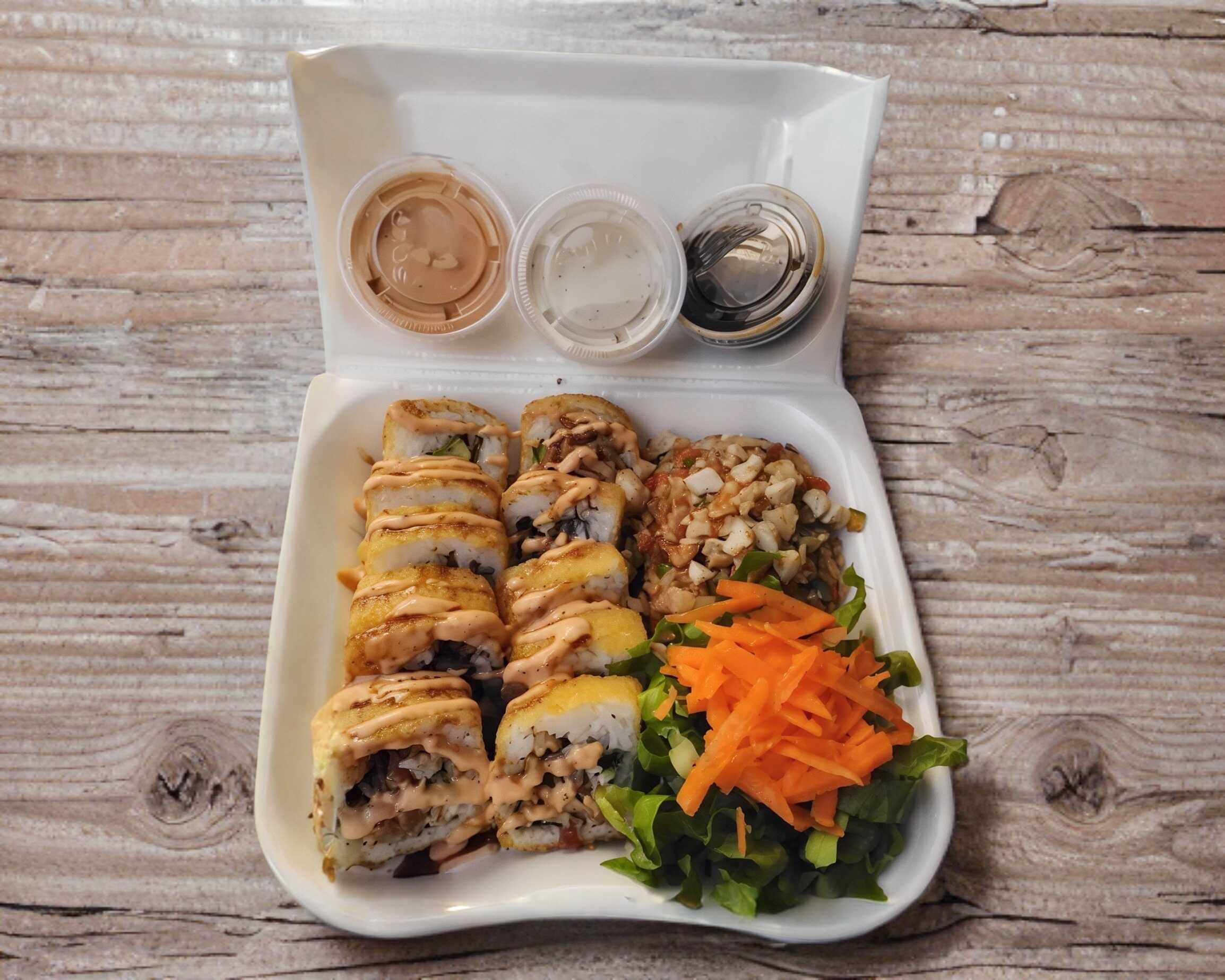 Dos rollos california de pollo y carne empanizados, acompañados con pasta bañada en salsa dulce de la casa