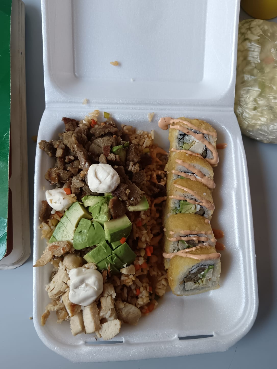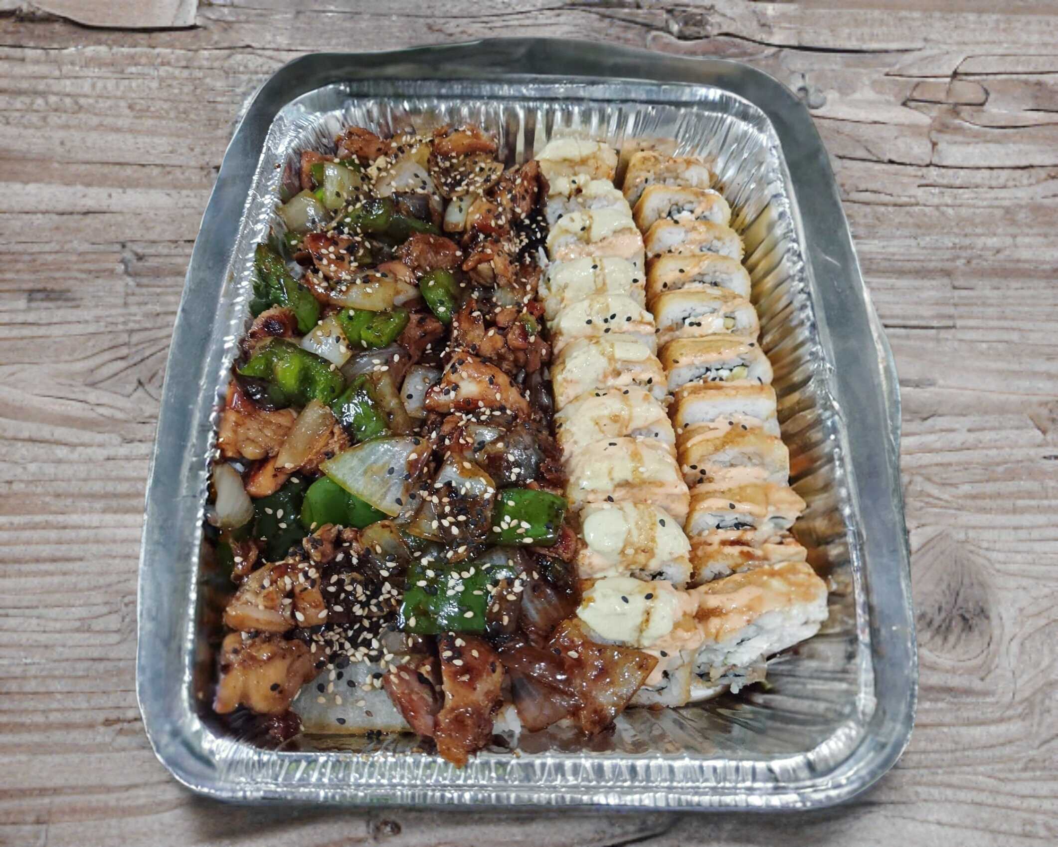 2 Rollos cielo mar y tierra con queso manchego. Una cama de aroz con cebolla y chile morron con polo desguesado teriyaki