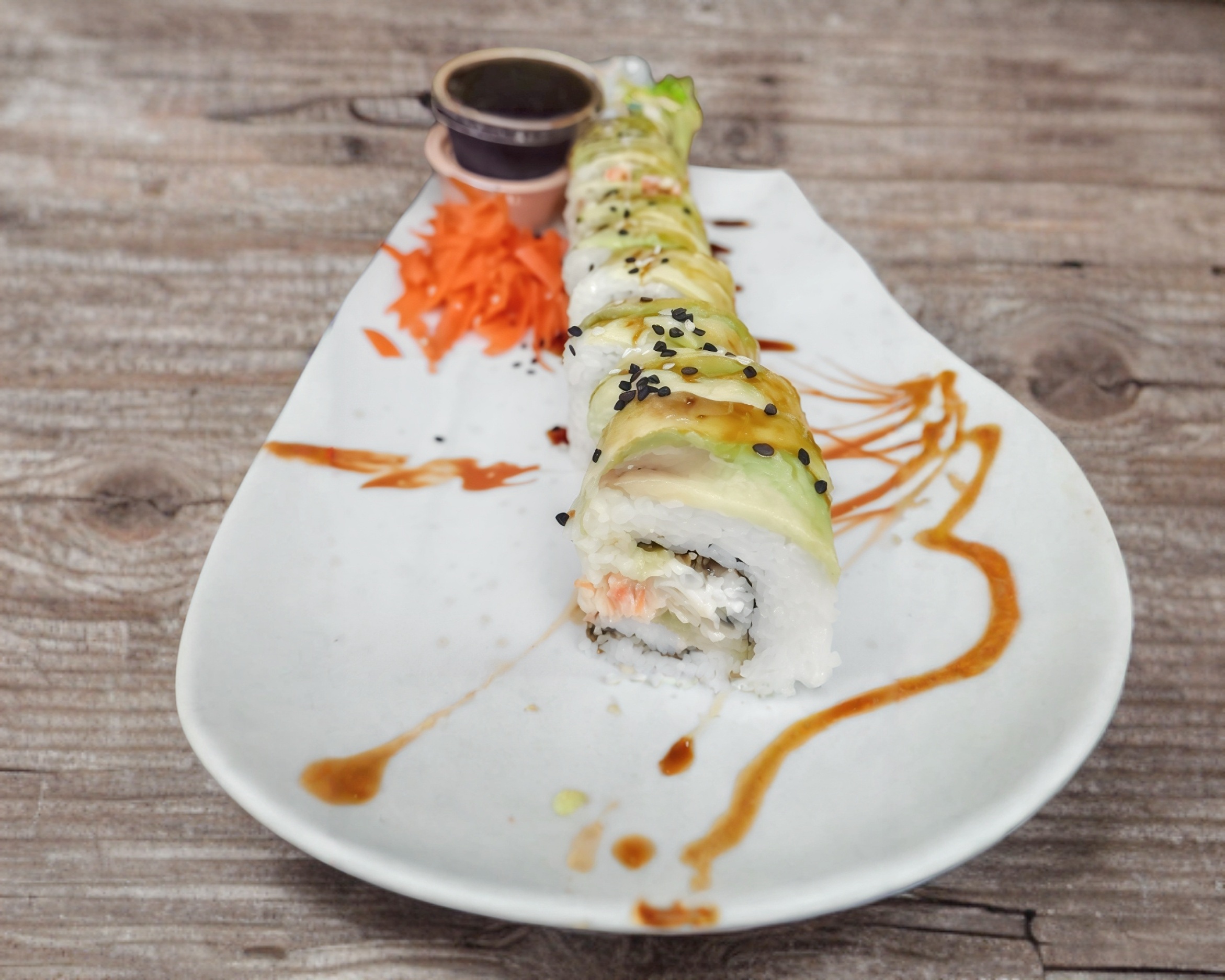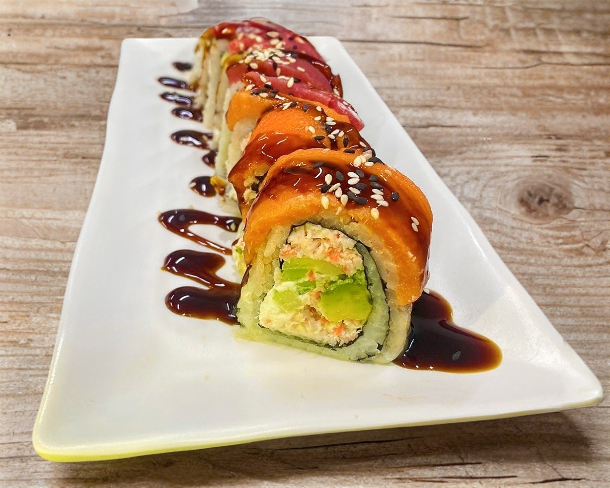 Philadelphia, pepino, aguacate, camarón, forrado de salmón y bañado en salsa especial.