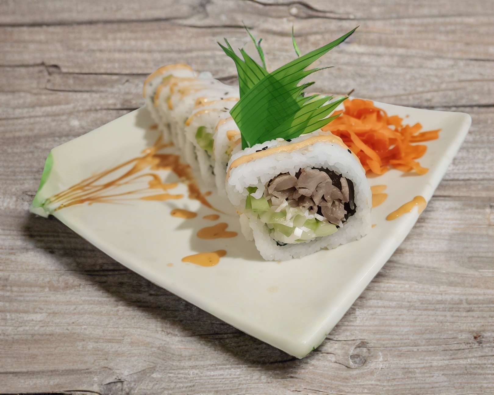 Philadelphia, aguacate, camarón capeado, forrado de tampico preparado y salseado con anguila.