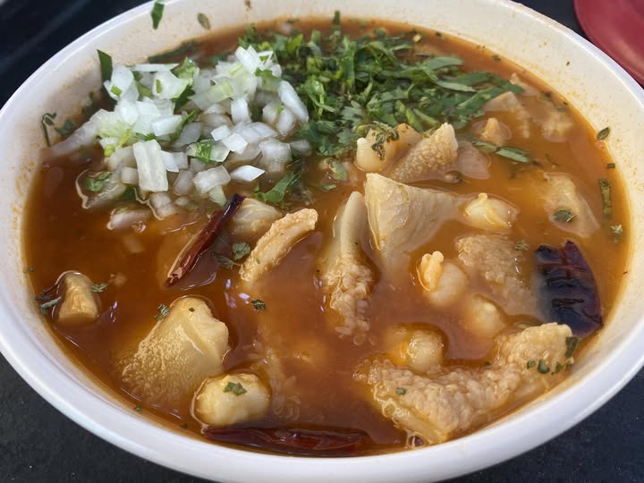 1 Litro de Menudo (grano y panza) rojo, acompañado de tortillas, cilantro, cebolla, limones y salsa