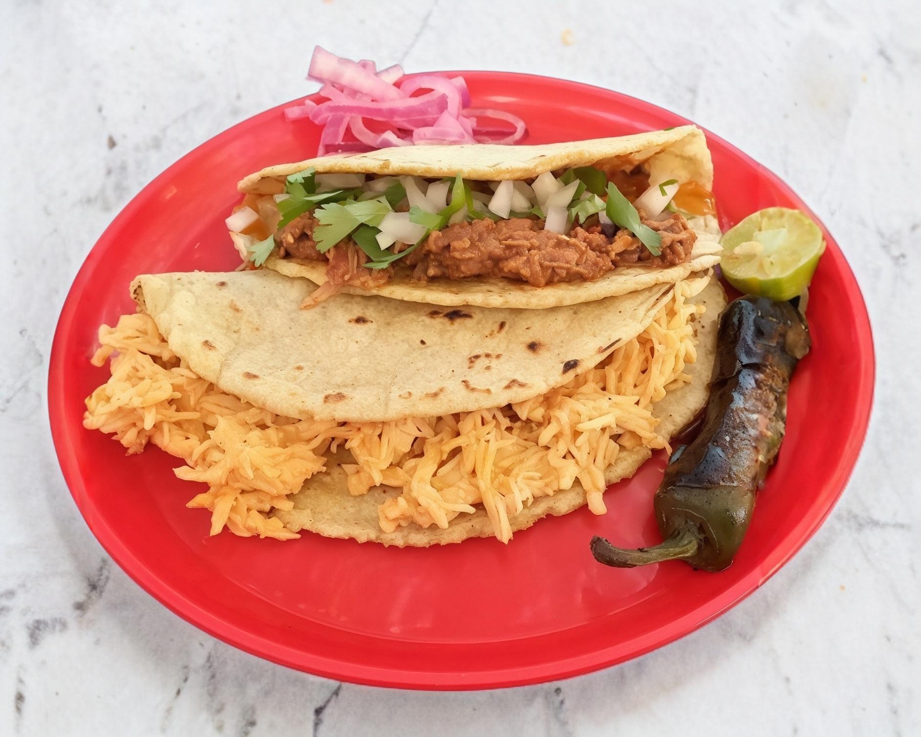 Quesadilla rellena con queso derretido y el guisado de tu elección.