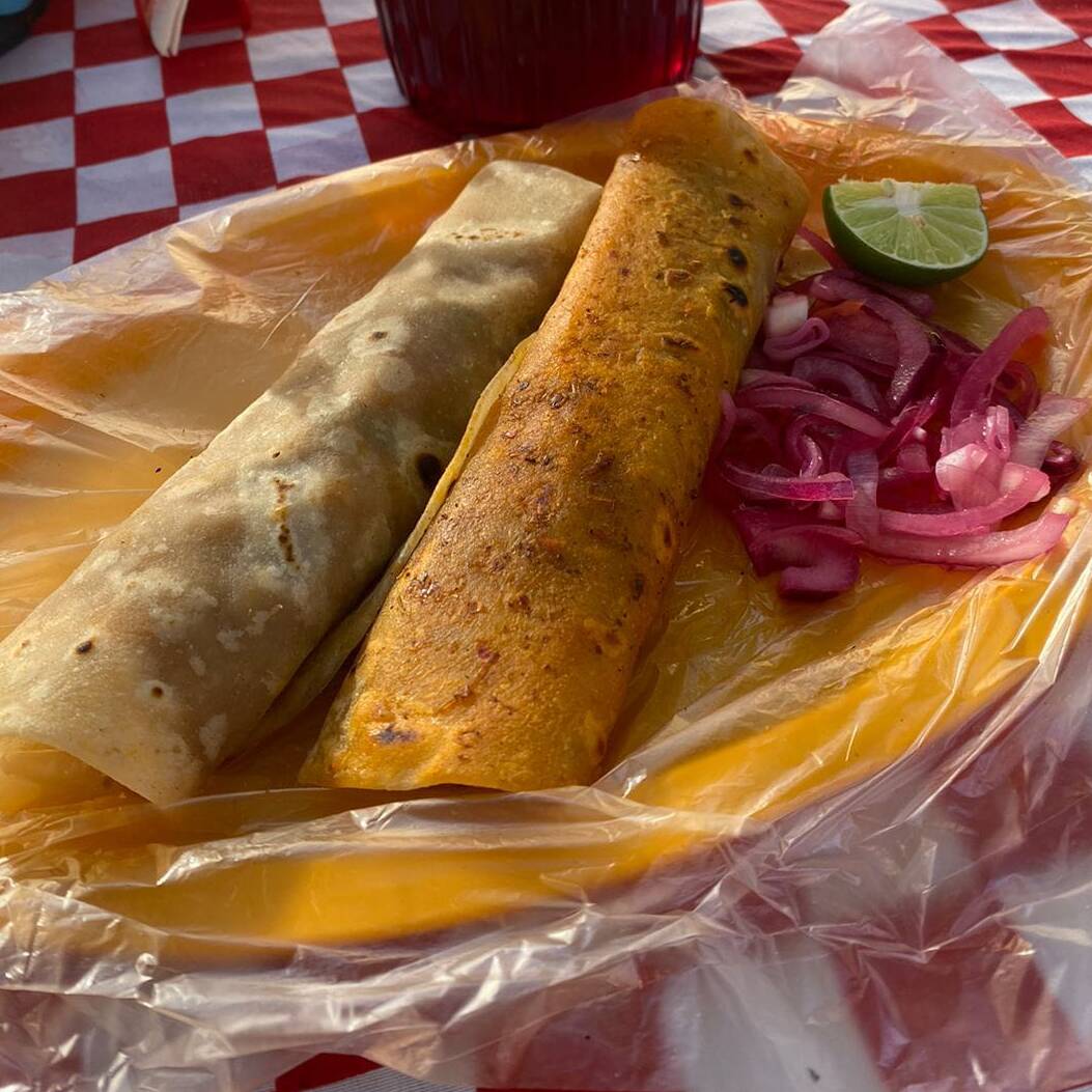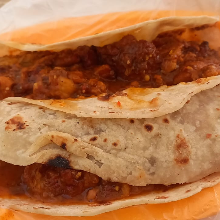 Taco de harina con birria de res estilo sinaloa, cocida a fuego lento con especias tradicionales.