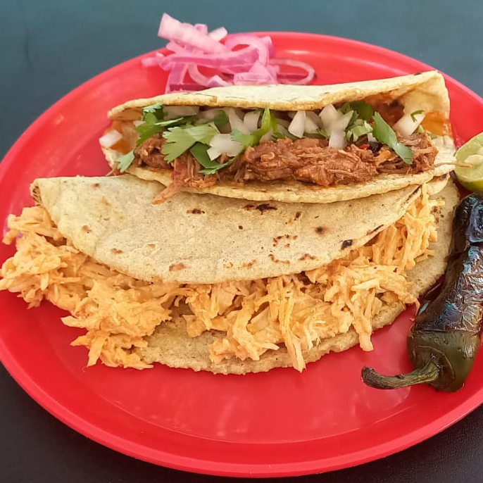 Taco de carne desebrada, en salsa de chile tomate y cebolla.