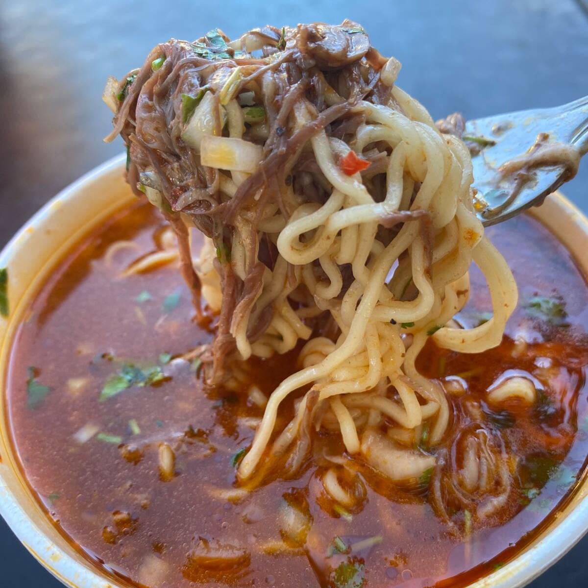 ramen, birria de res, queso monterrey, consome, 2 torrtillas maiz.
