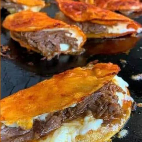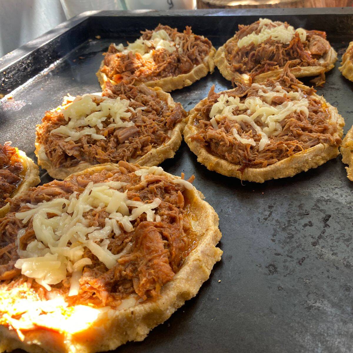Masa gruesa de maíz pellizcada, con aciento de puerco, queso monterrey y guisado a tu eleccion bañado de mas queso monterey.