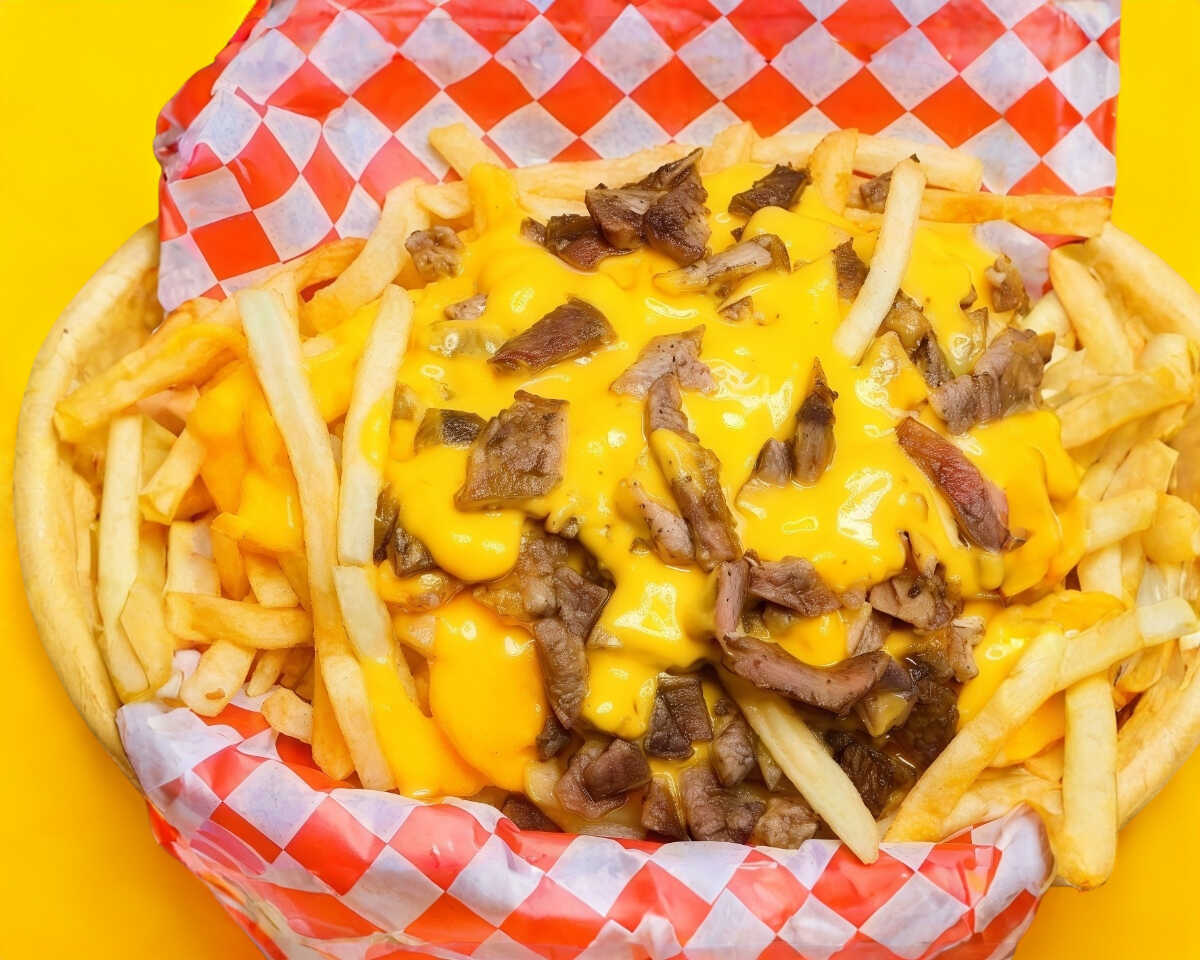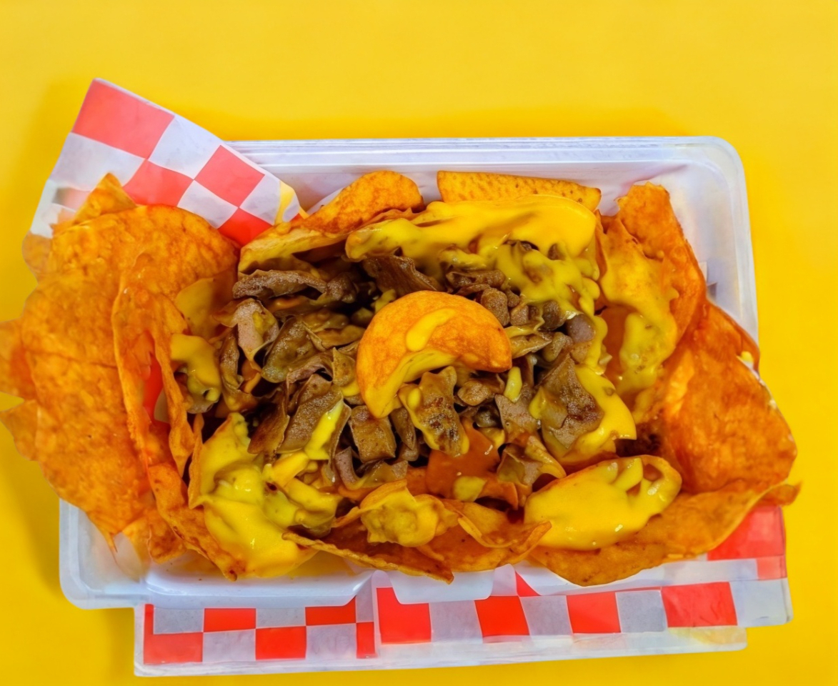 Orden de 200 g de papas fritas, bañadas en queso fundido con o sin chili beans.