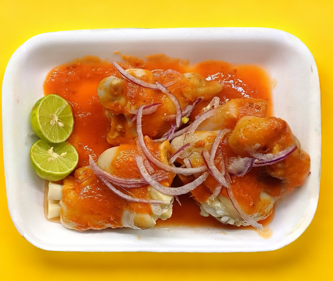 Un pipo, 100 g de papas, 100 g de boneless, acompañados con aderezos y chiles jalapeños.