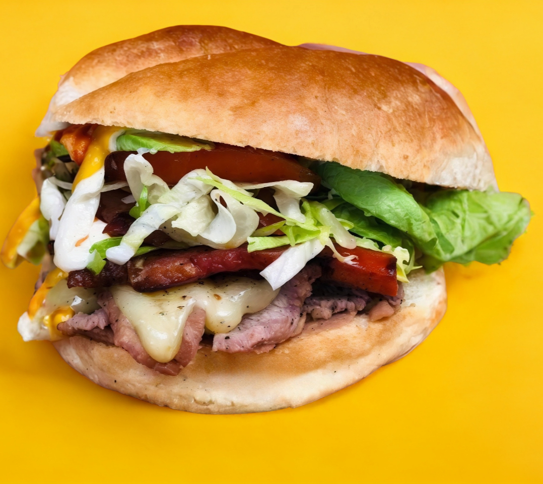 Pan telera con queso, mayonesa, queso amarillo, carne asada, lechuga, cebolla y aguacate.