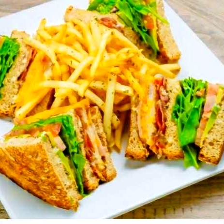 3 Rebanadas de pan de barra con jamón, queso amarillo, queso Monterrey, tocino, pechuga de pollo a la plancha, lechuga, cebollas, aguacate con una guarnición de papas a la francesa.