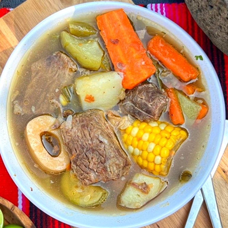 delicioso caldo de res elaborado con chambarete de res con sus verduras de temporada
