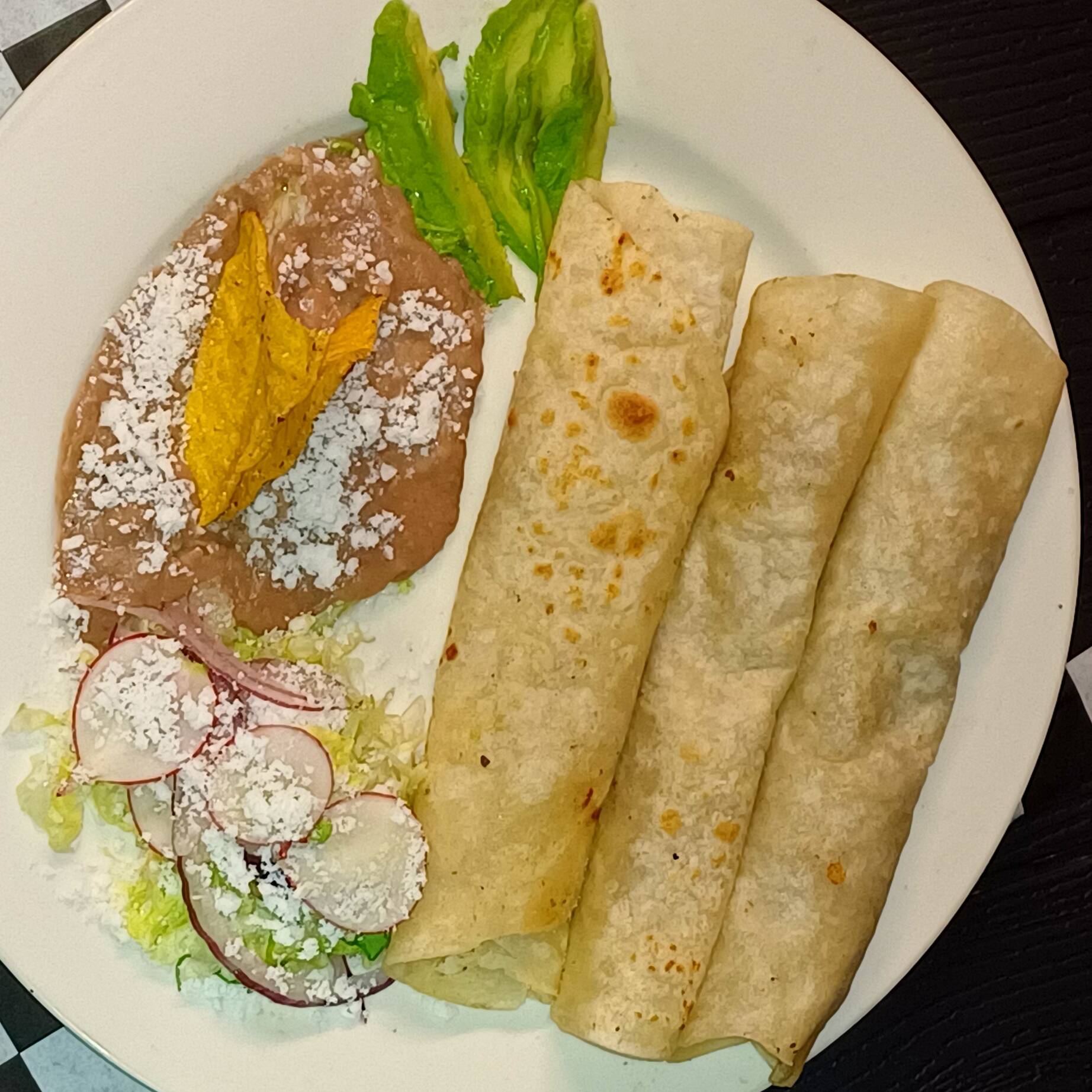 Docena de flautas, repollo, cebollas, pepino, aguacate, queso crema al gusto, acompañadas con un consomé y salsa de tomate sin picante.