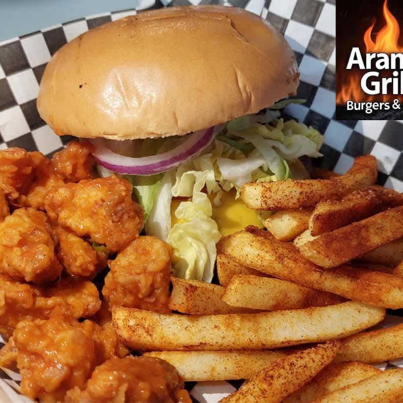 Pan parrillero, deliciosa carne asada al carbon, queso, aderezo de la casa y vegetales. Acompañada de papas, bebida y boneless