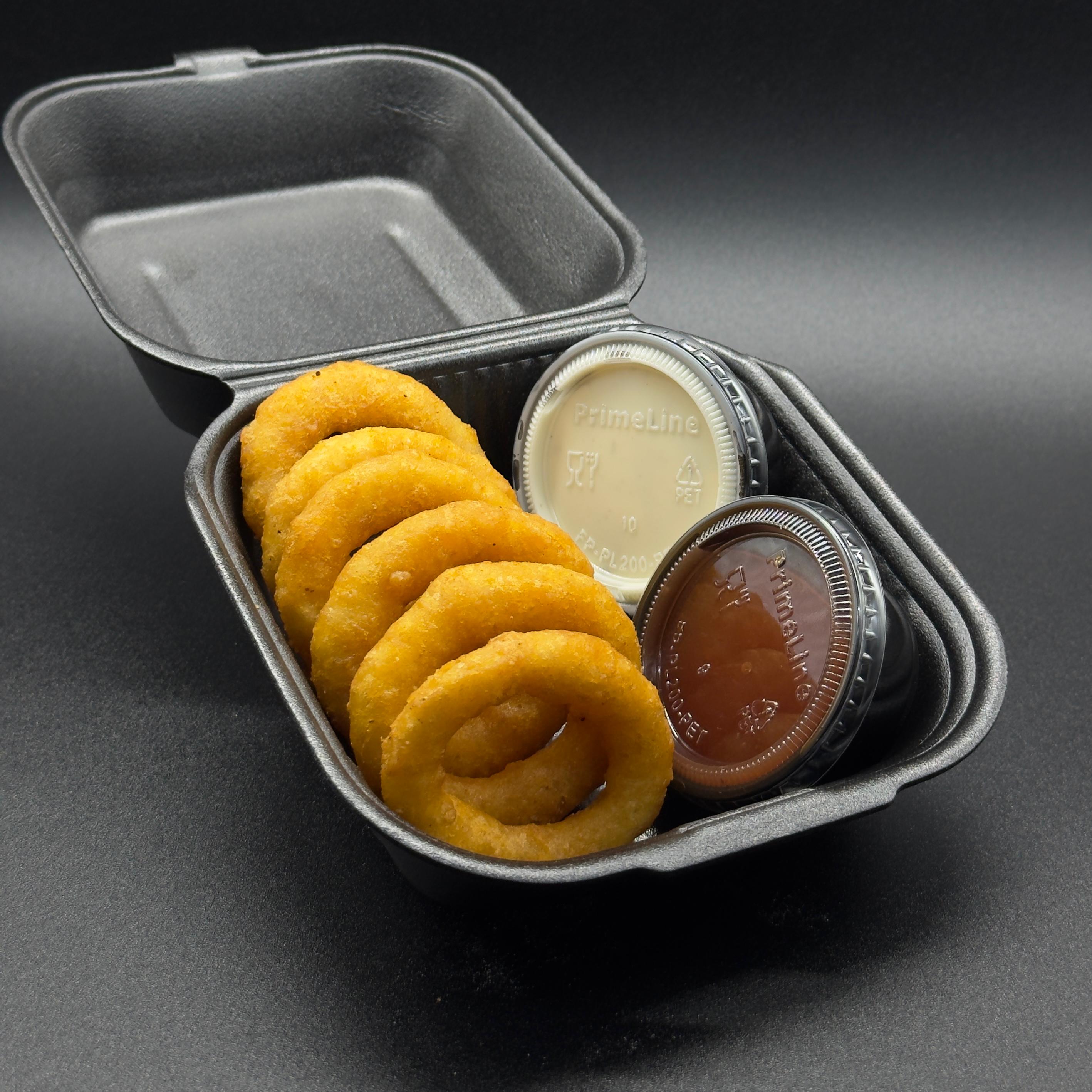6 Aros de cebolla acompañados de y kétchup.