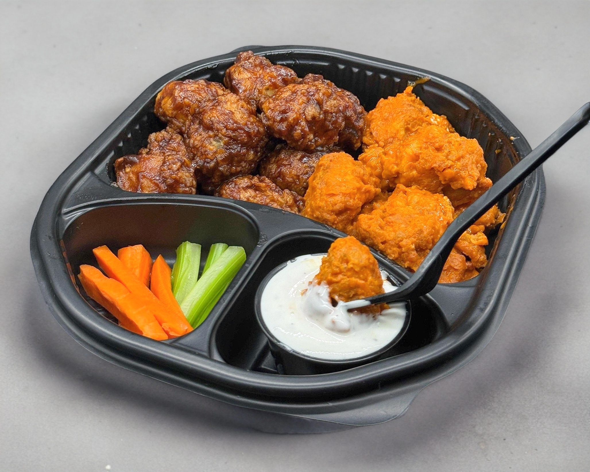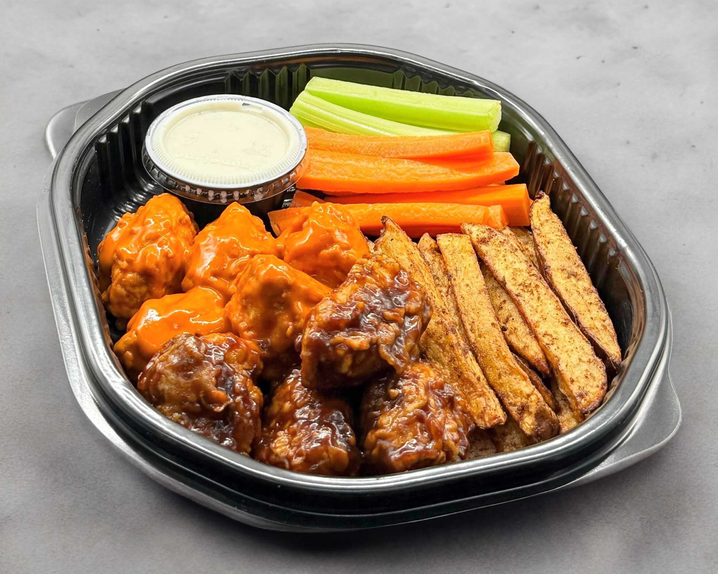 280 Gramos (12 a 15 Piezas) Boneless, papas, zanahoria, apio y ranch.