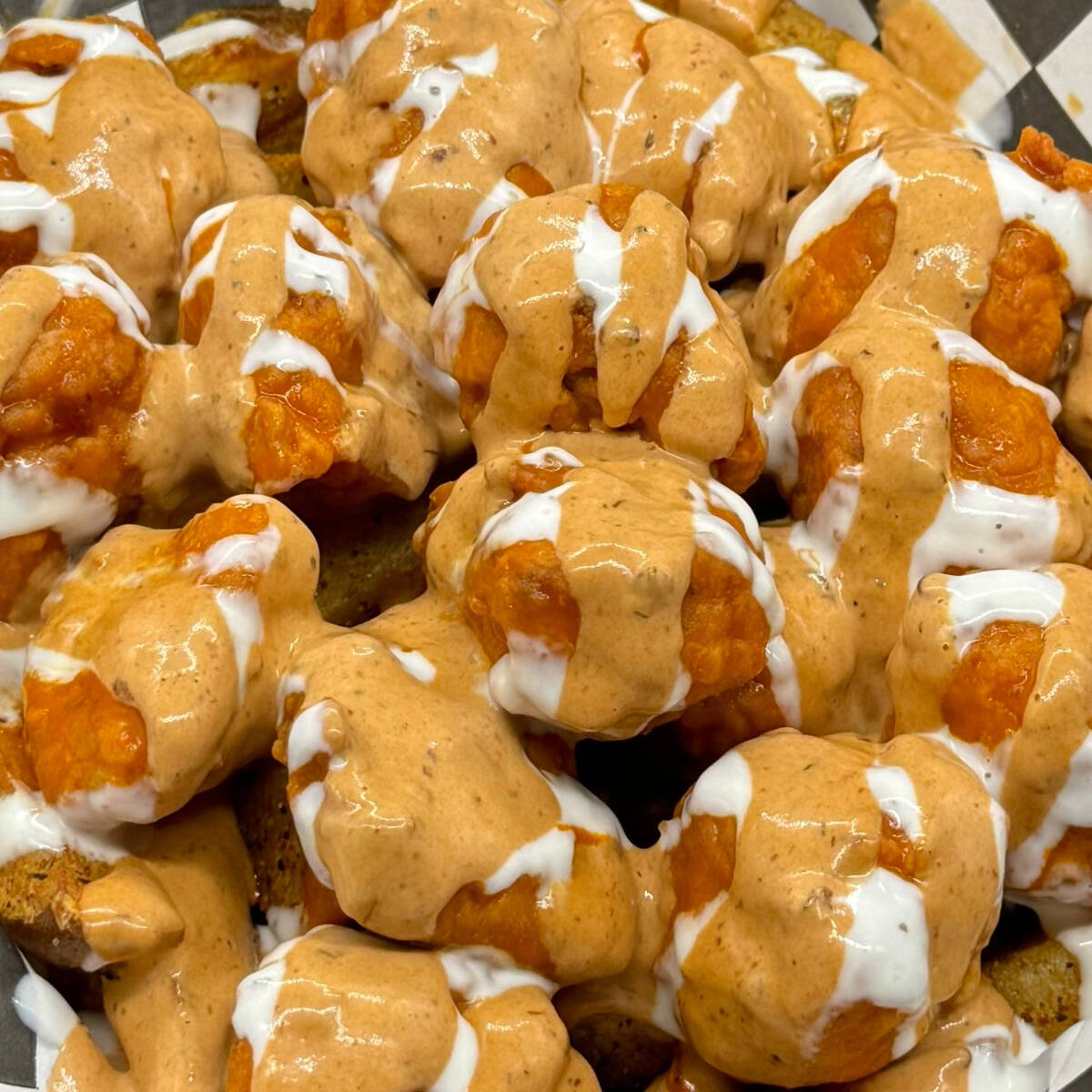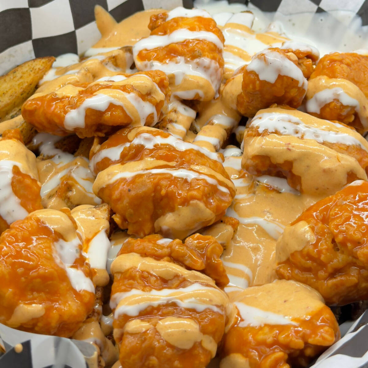 350 Gramos (16 a 19 Piezas) Boneless, papas, aderezo chipotle & ranch.