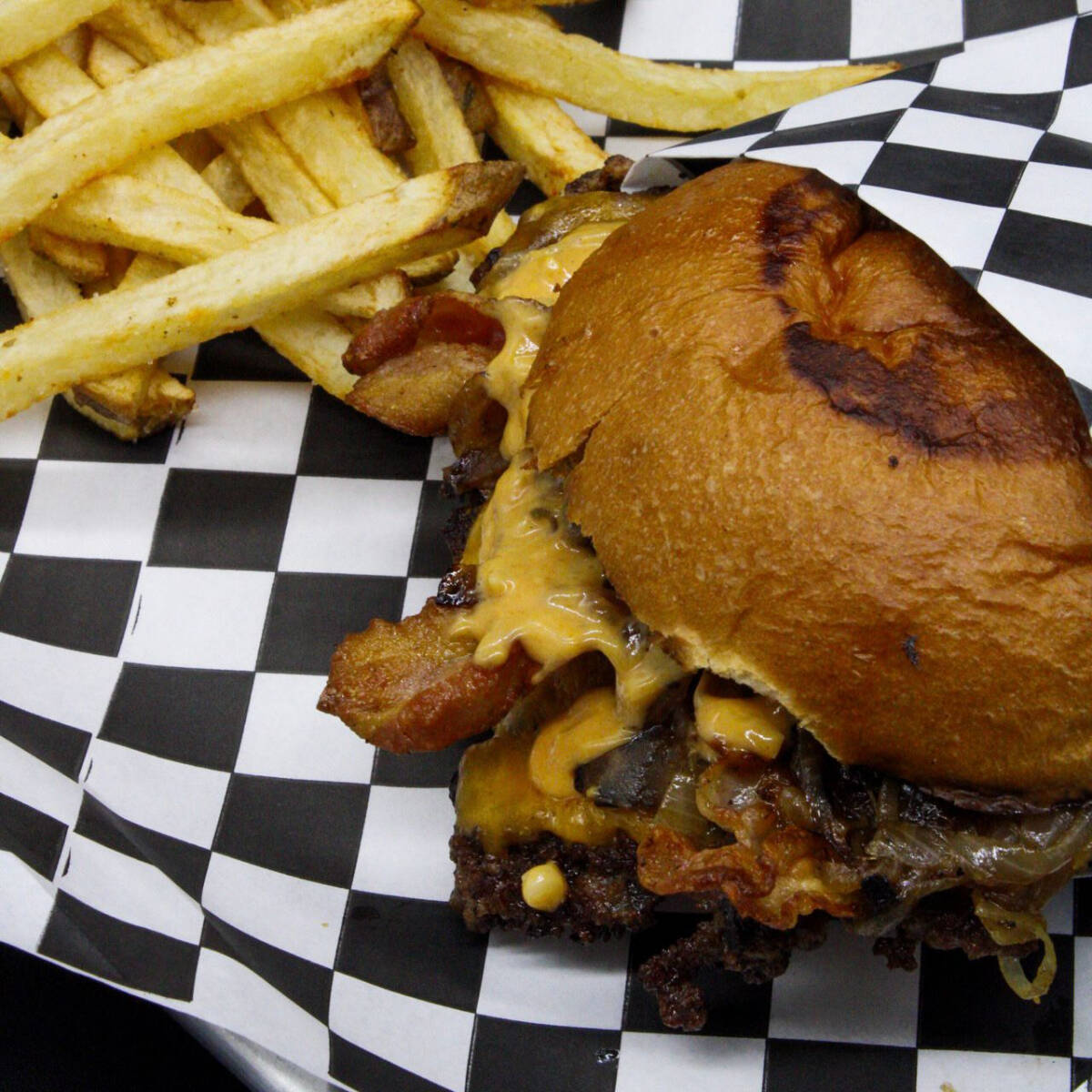 Carne smash bien jugosa, queso americano, tocino crujiente, cebolla caramelizada y todo el sabor de la casa. Incluye 250 g de papas doradas, más carne, más sabor, la favorita.