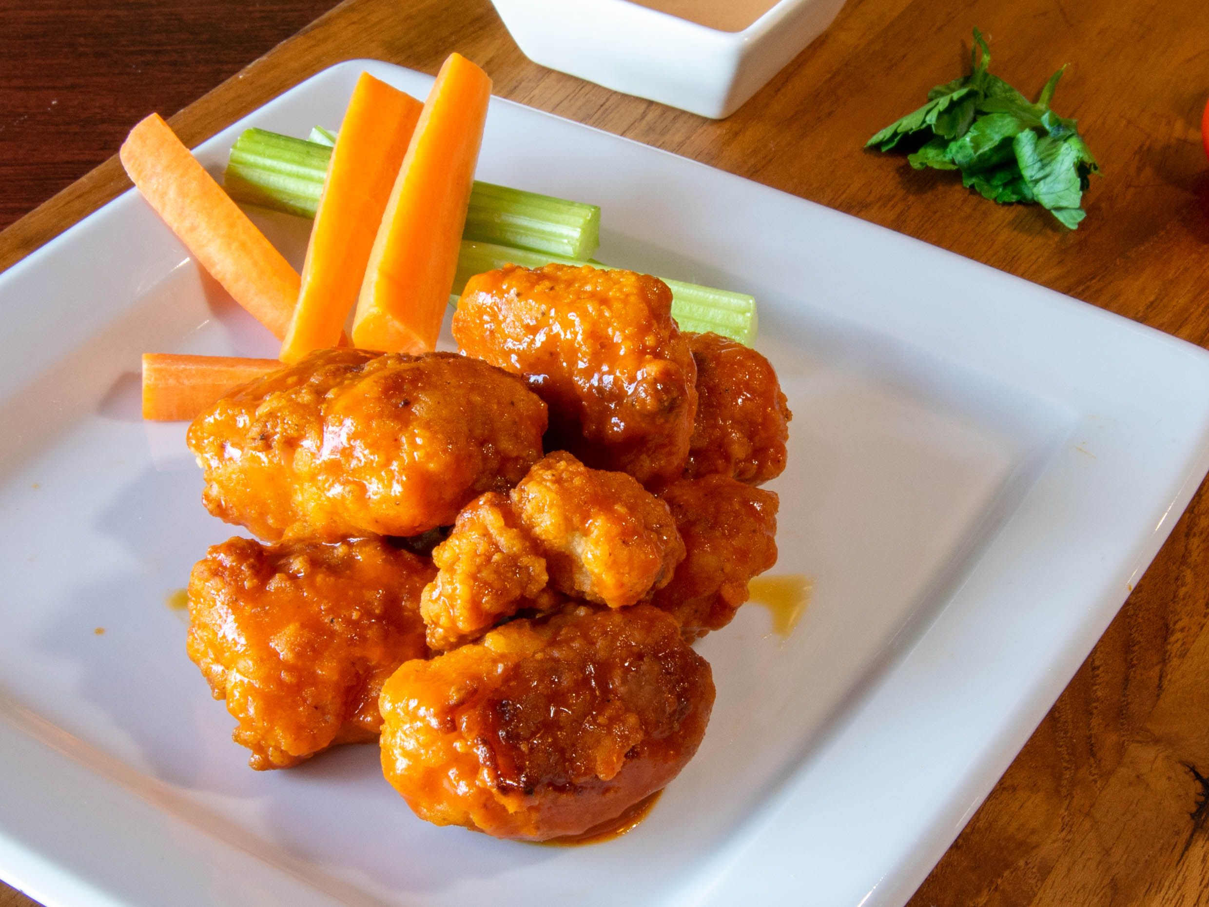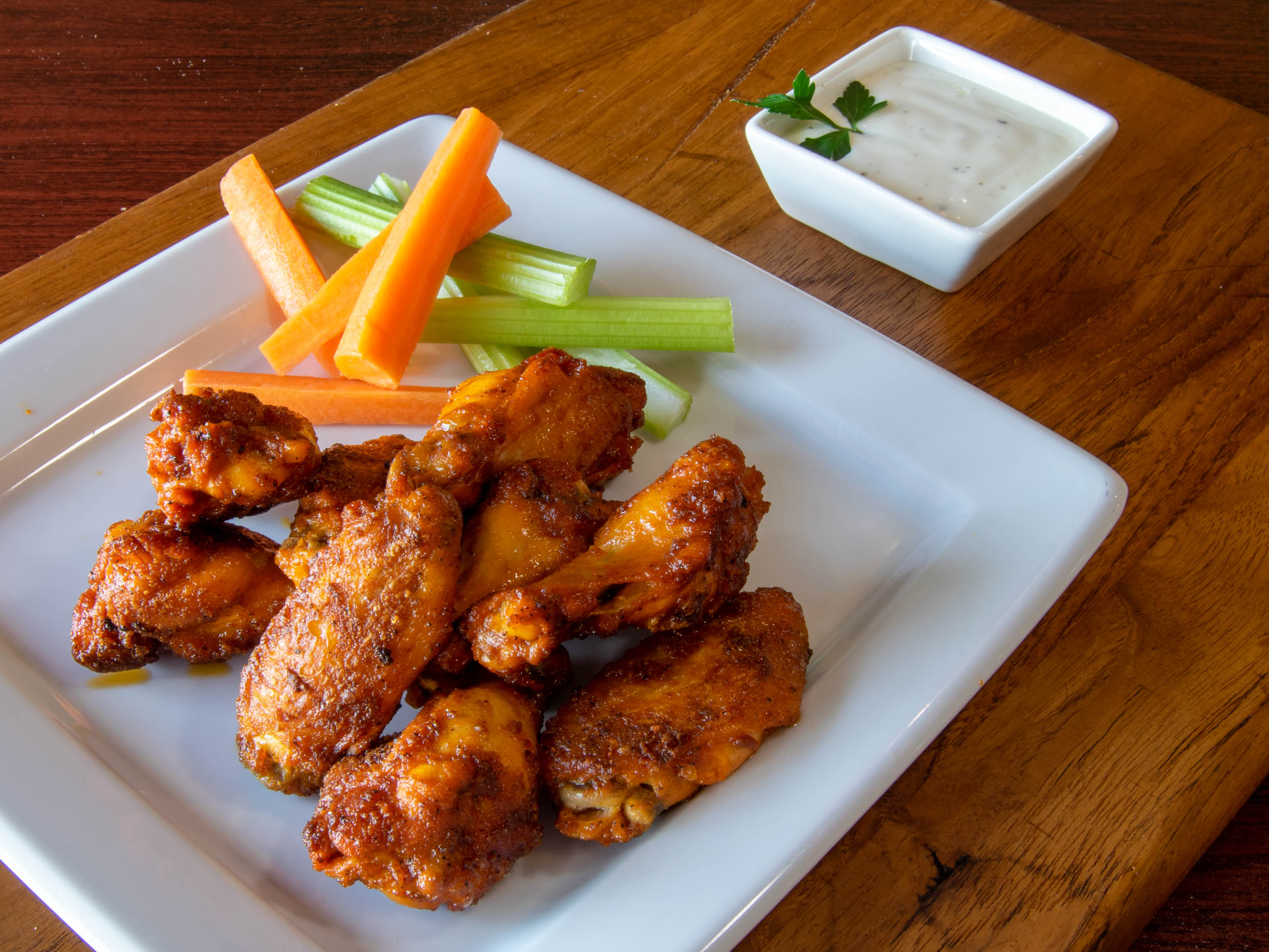 Ligeramente picositas y doraditas a la leña servidas con aderezo ranch zanahoria y apio .