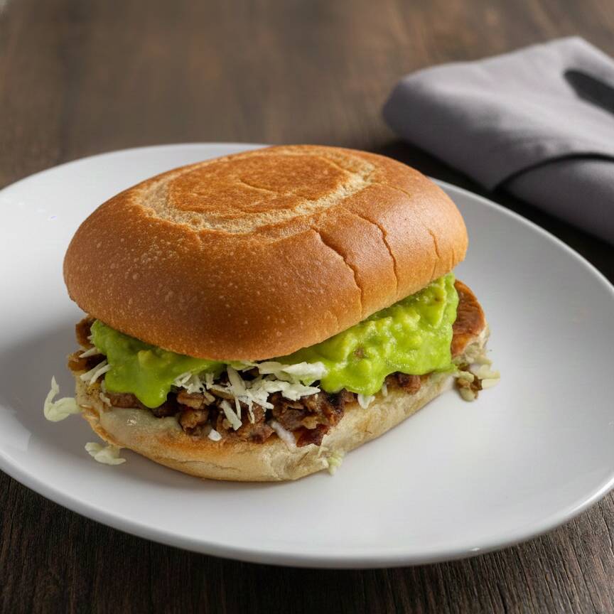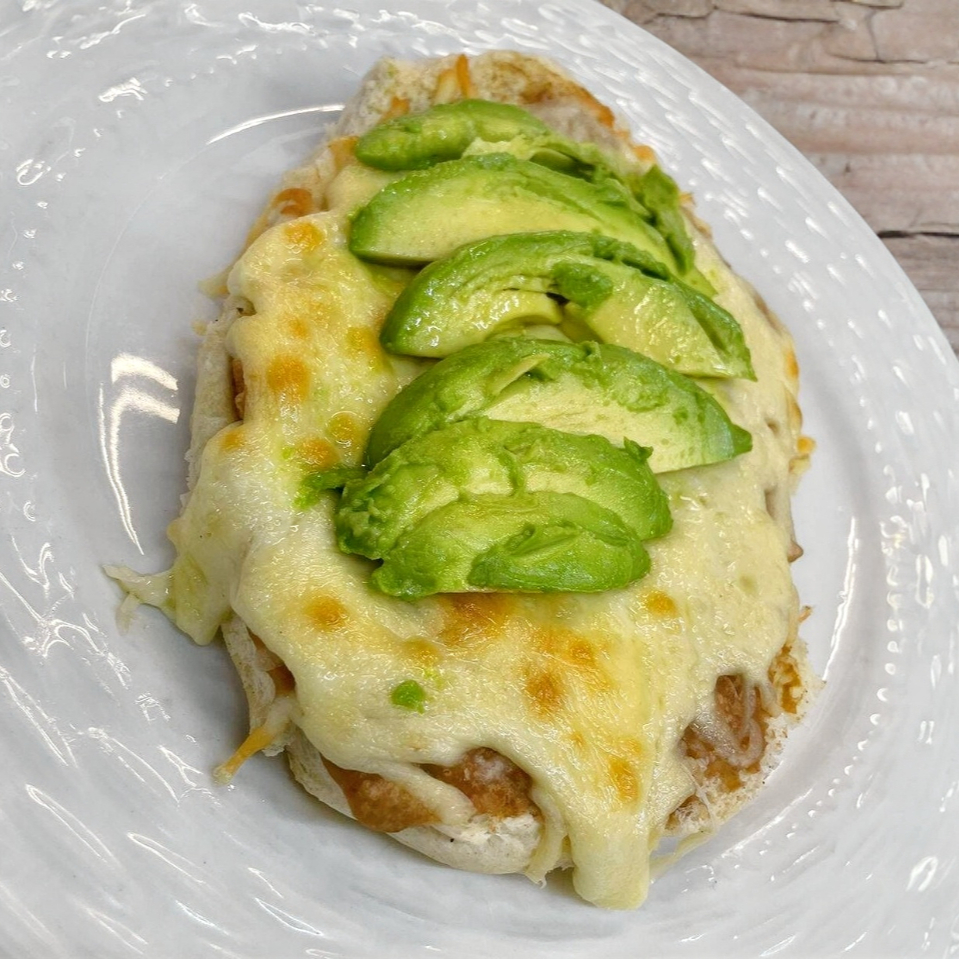 Medio pan de torta con frijoles refritos y queso y aguacate
