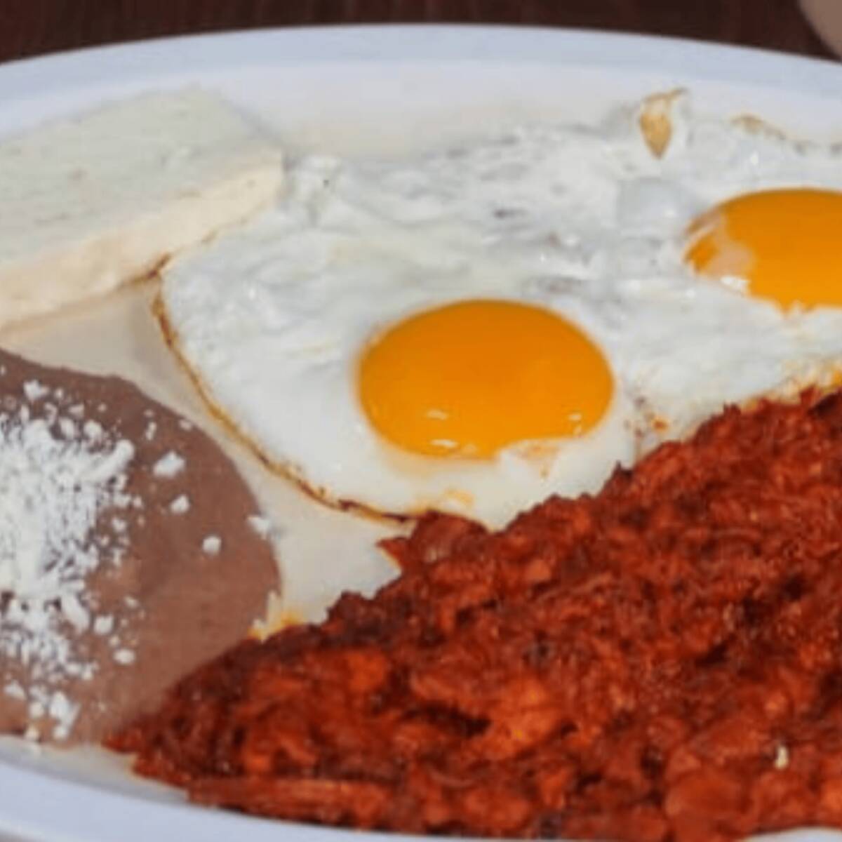 Chilorio, dos huevos, queso fresco y frijoles refritos