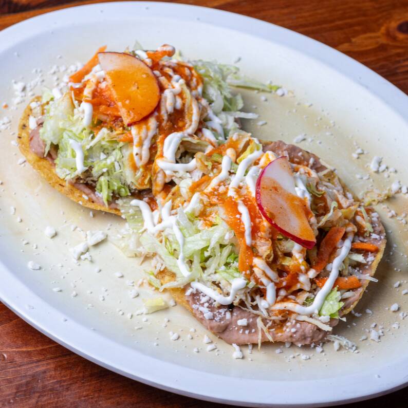 Sope de tortilla de maíz gruesa, proteína a elección, pico de gallo, salsa de tomatillo, frijoles, guacamole, zanahoria, repollo, rábano y limones.