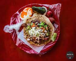 (1 pieza de Tortilla rellena con (carne de res jugosa 40 gramos aprox) acompañada de 2 onzas de guacamole fresco y una selección de salsas picante bandera repollo cebollas curtidas con jalapeño y rábano trae tomate cebolla chile cilantro y Salsa bandera - Salsa roja (porción personal)