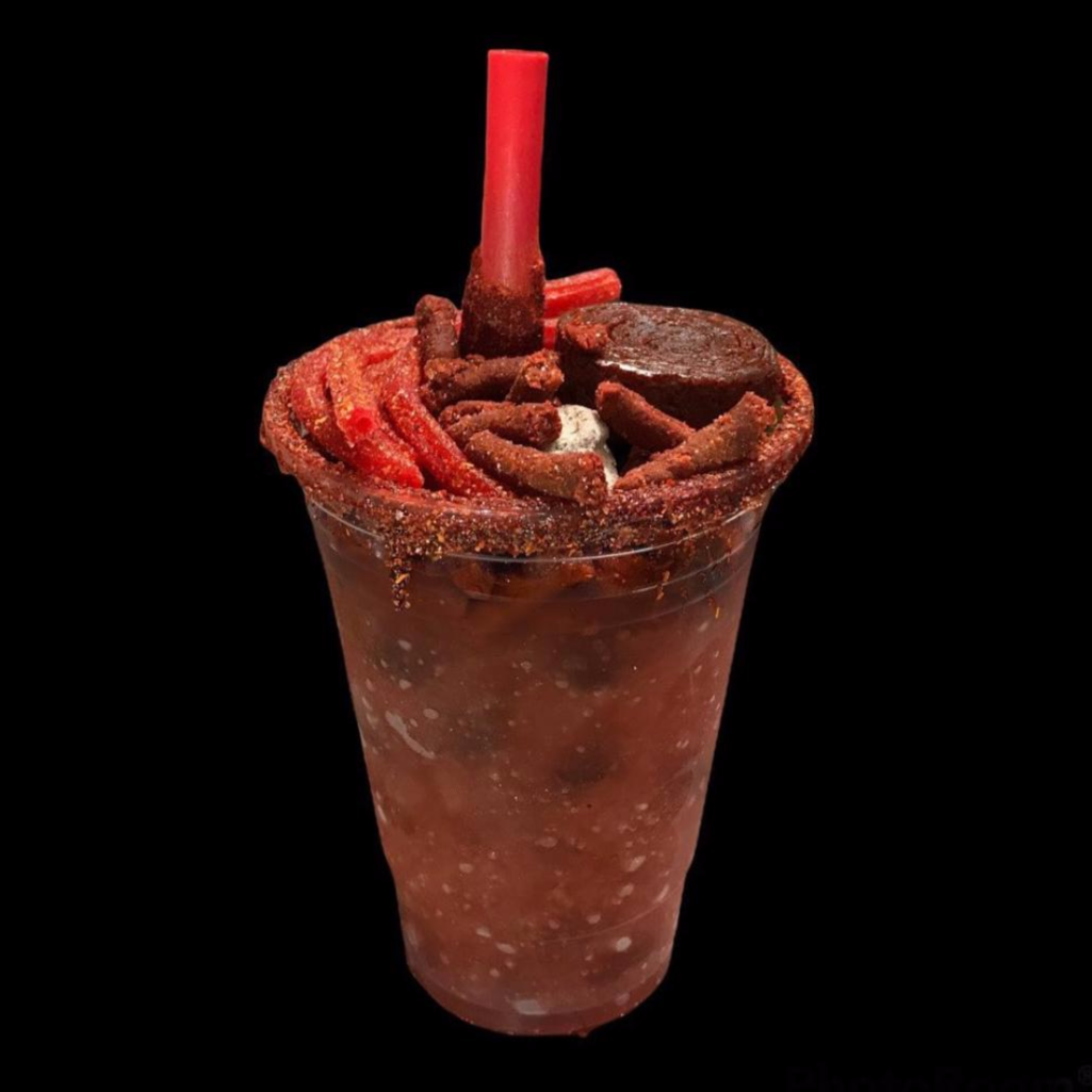 Chaca chaca, pepino, serpentina, tamaroca, cuerito y clamato. VASO 16oz