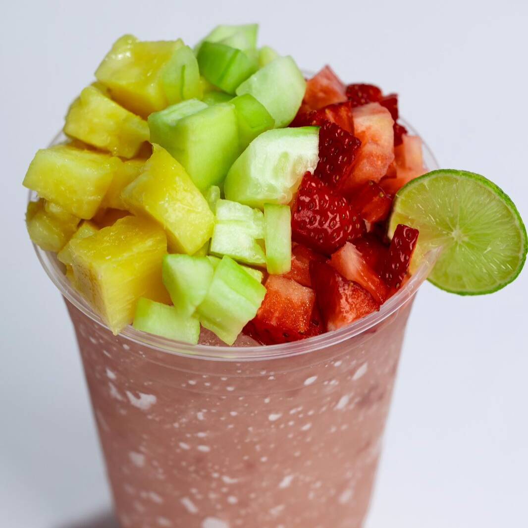 Fruta a elegir chamoy preparado, chile en polvo, Chaca Chaca y serpentina.