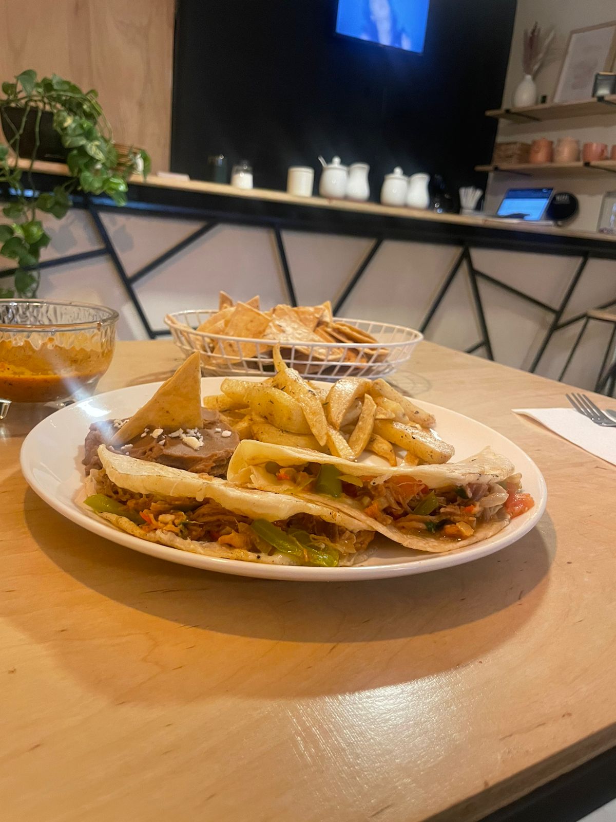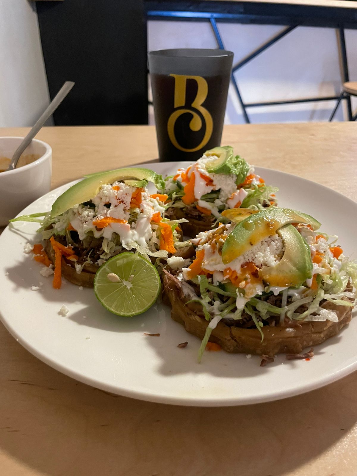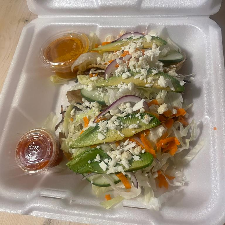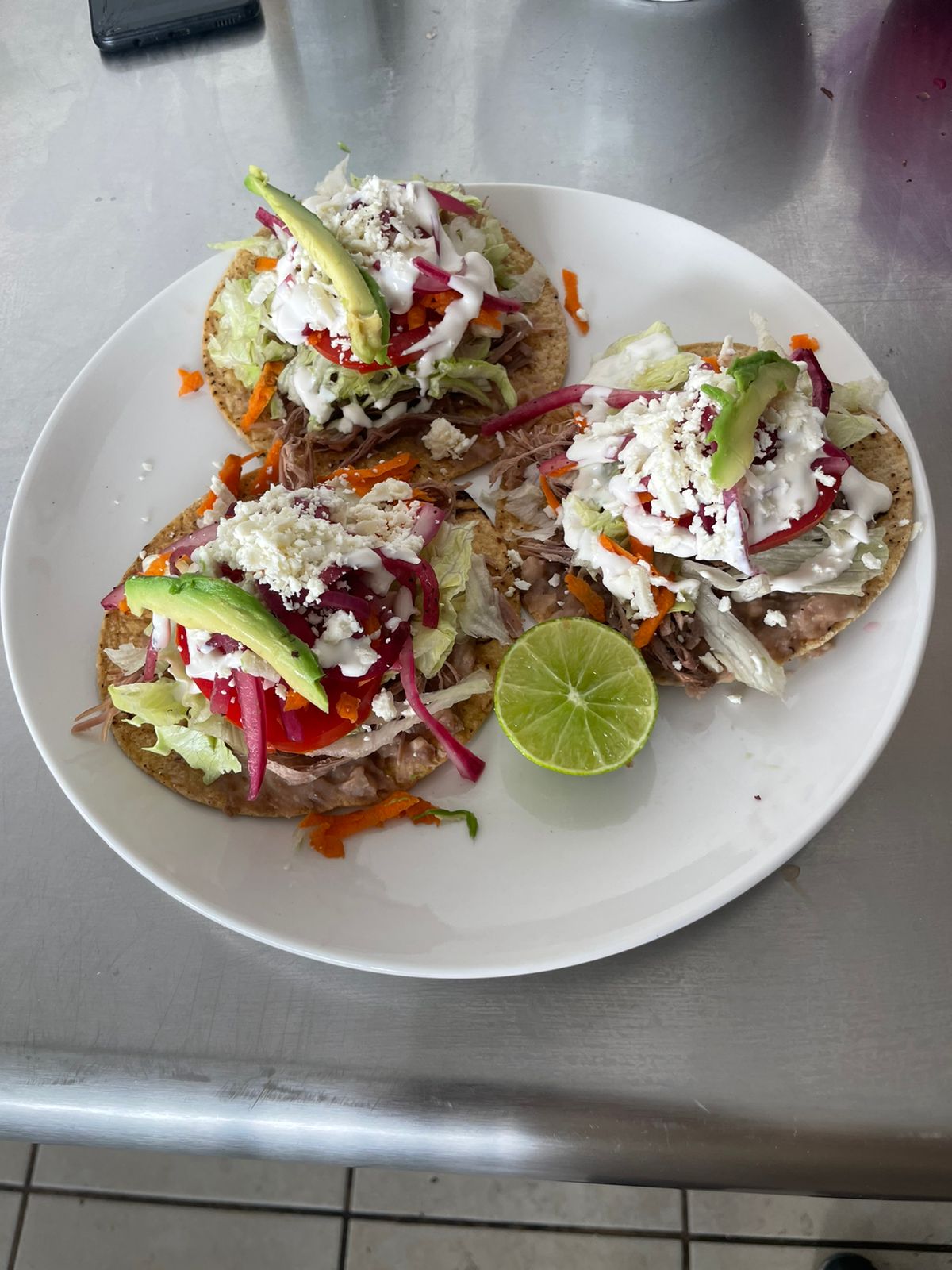 Orden de 3 piezas, frijol, carne deshebrada, lechuga, tomate, cebolla, queso cotija y crema acompañadas de consomé.