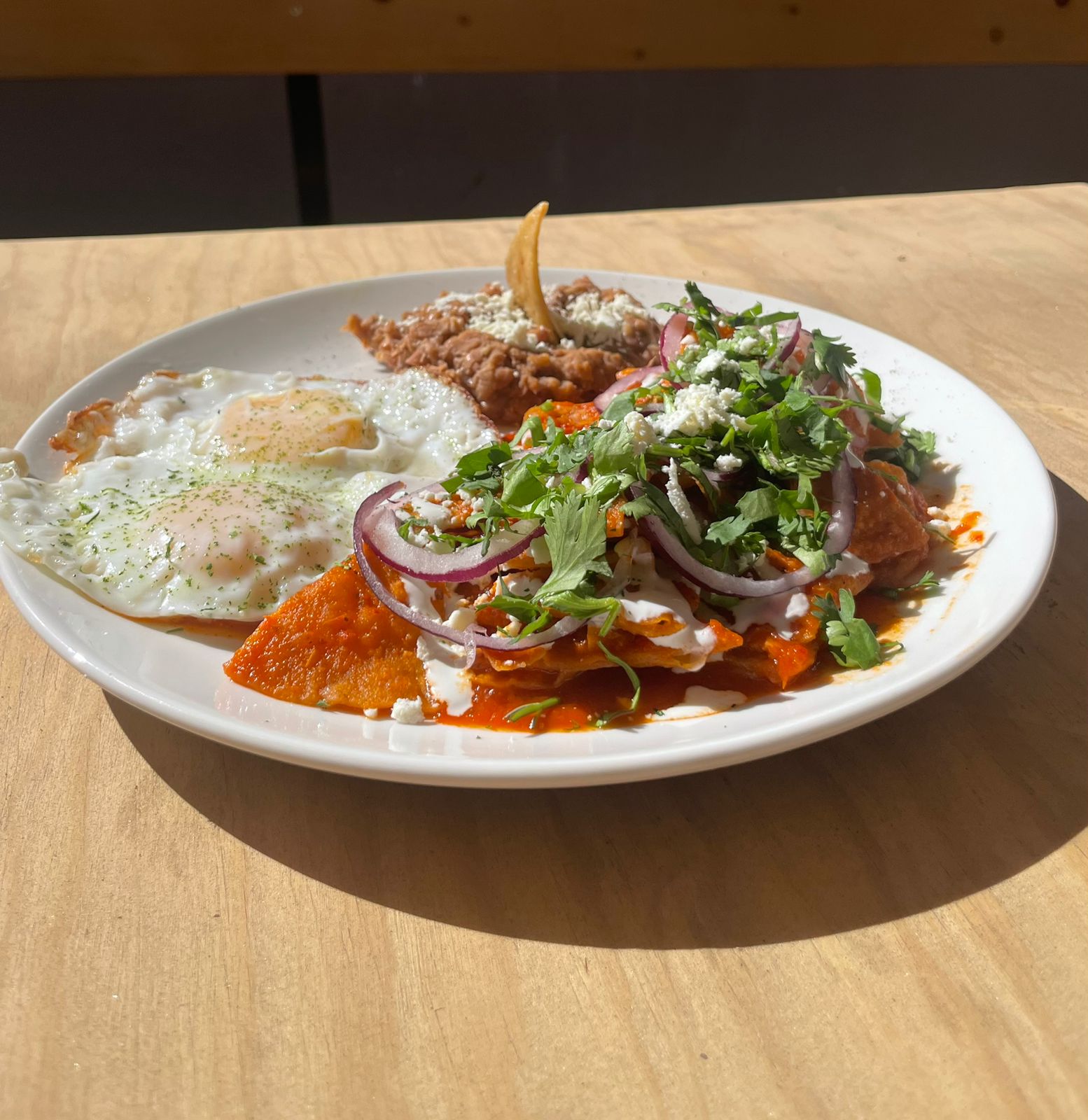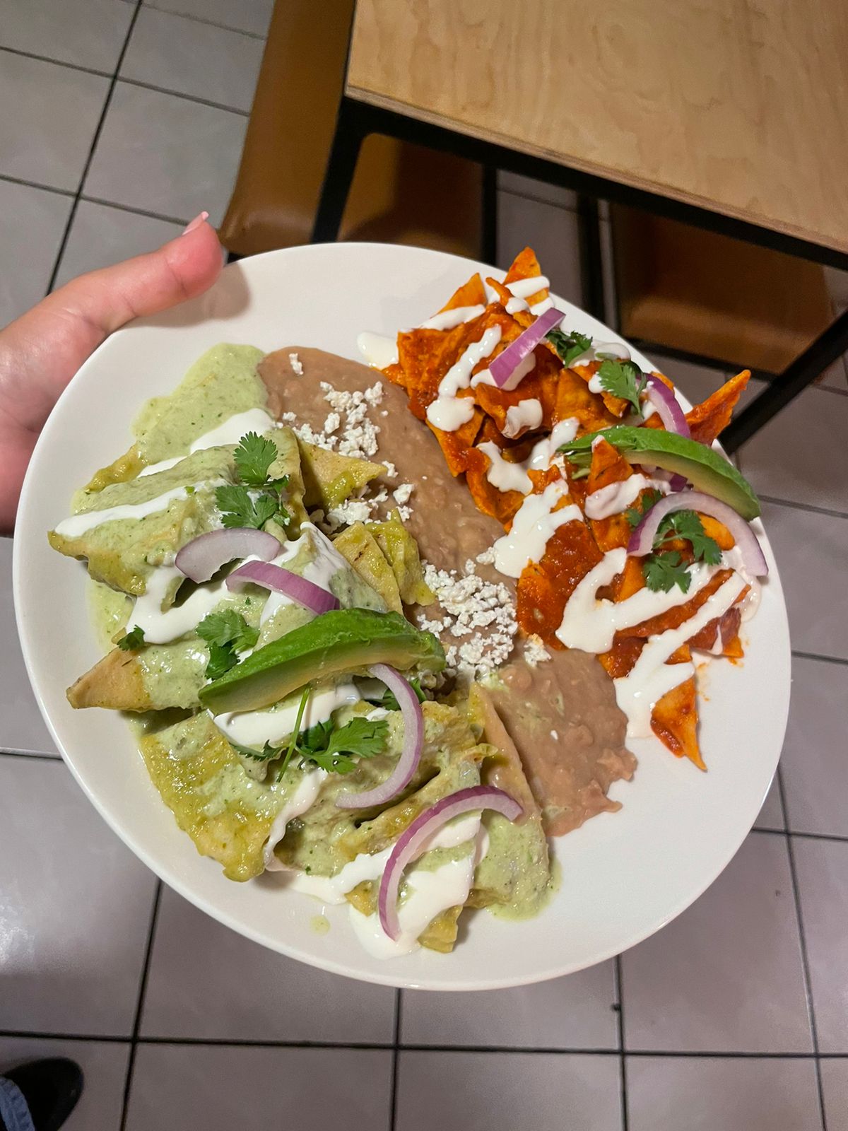 Chilaquiles con una mitad en salsa roja y otra en salsa verde, combinados en un delicioso contraste de sabores.