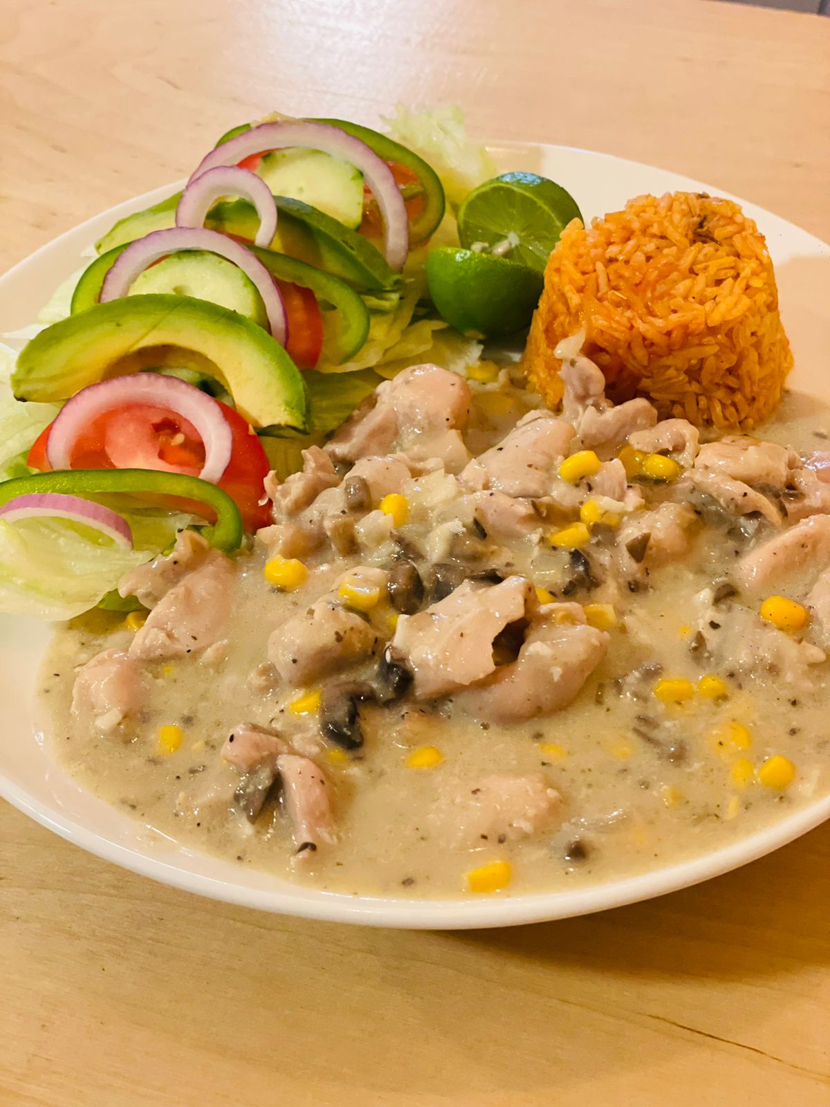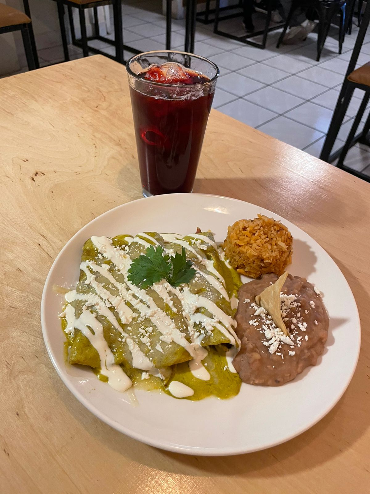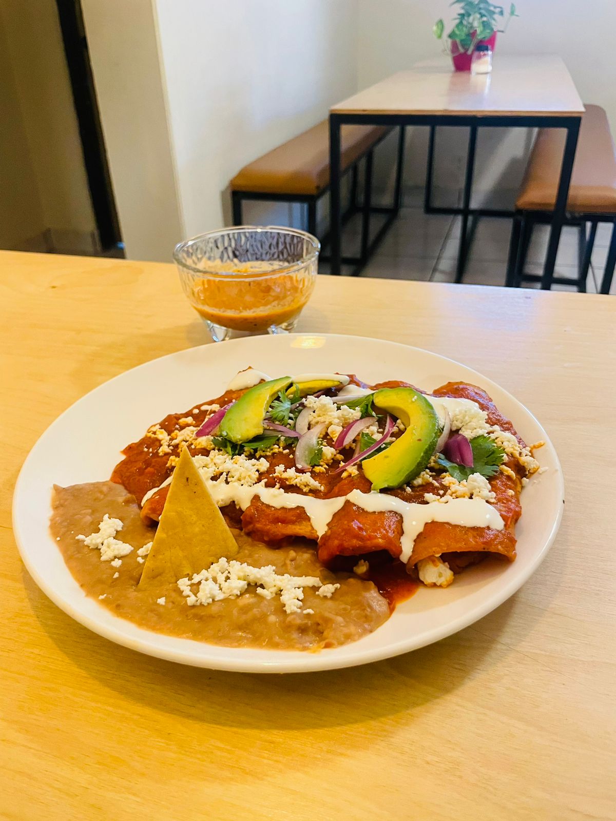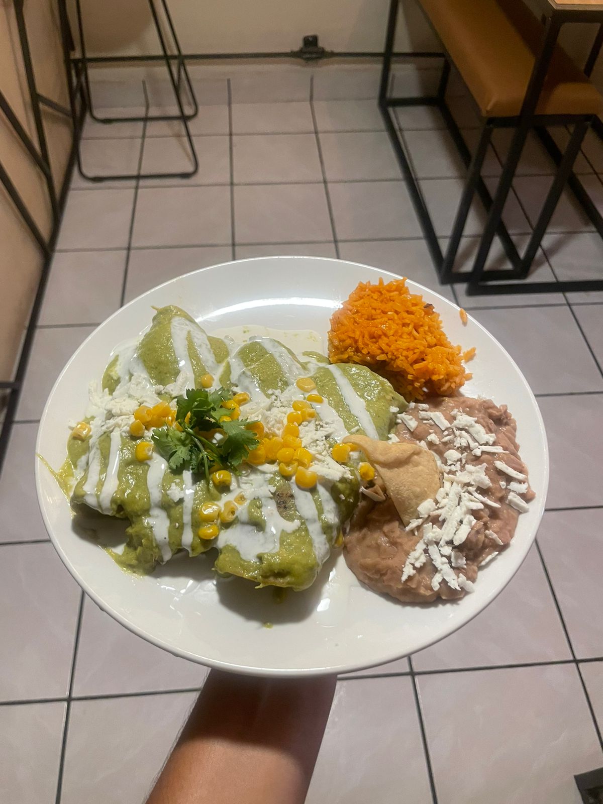 Enchiladas rellenas de pollo bañadas en una rica salsa poblana, acompañadas de arroz, frijoles, queso cotija y crema.