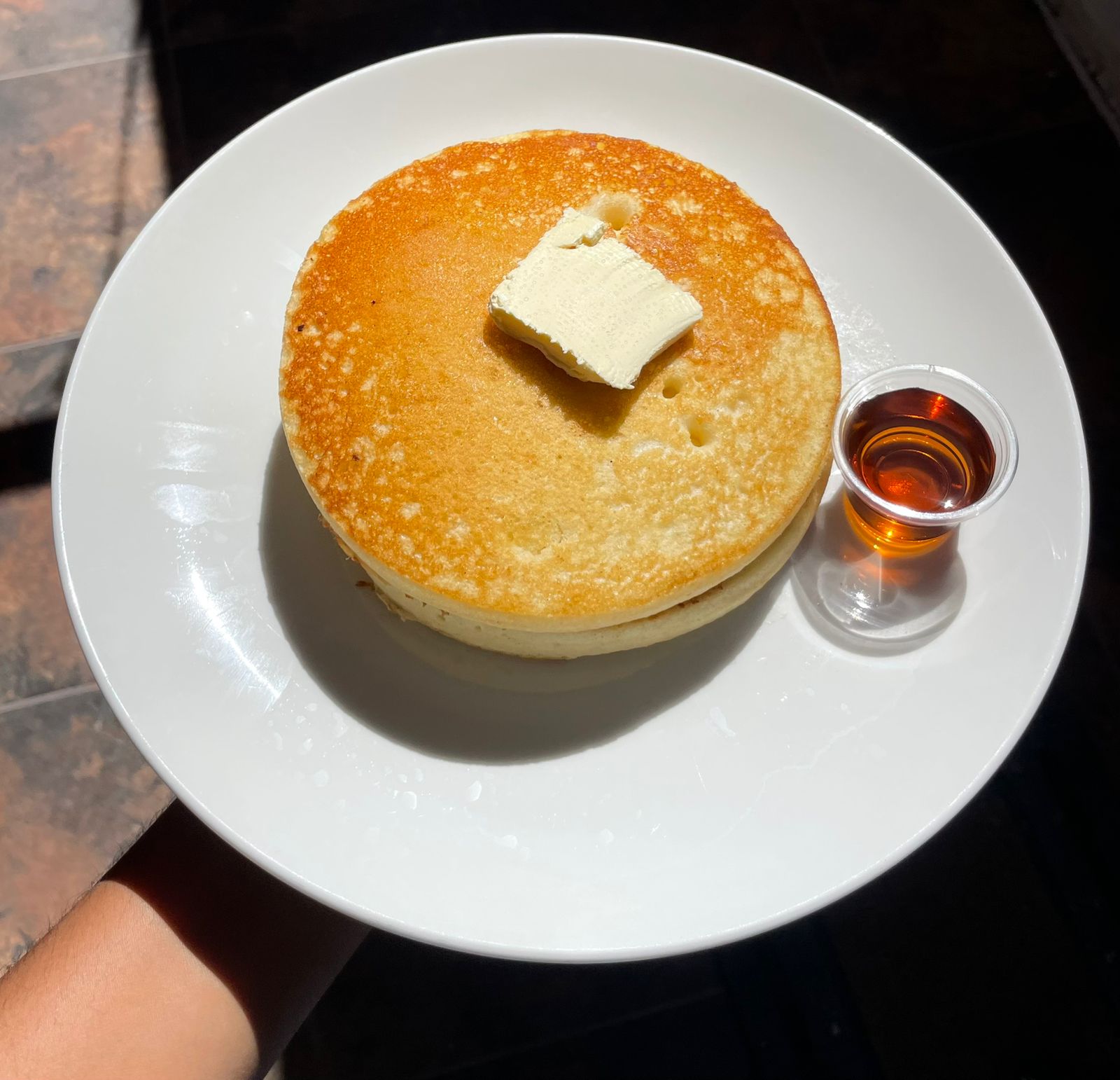 Hot cakes clásicos servidos con mantequilla, miel y un toque de azúcar glass.
