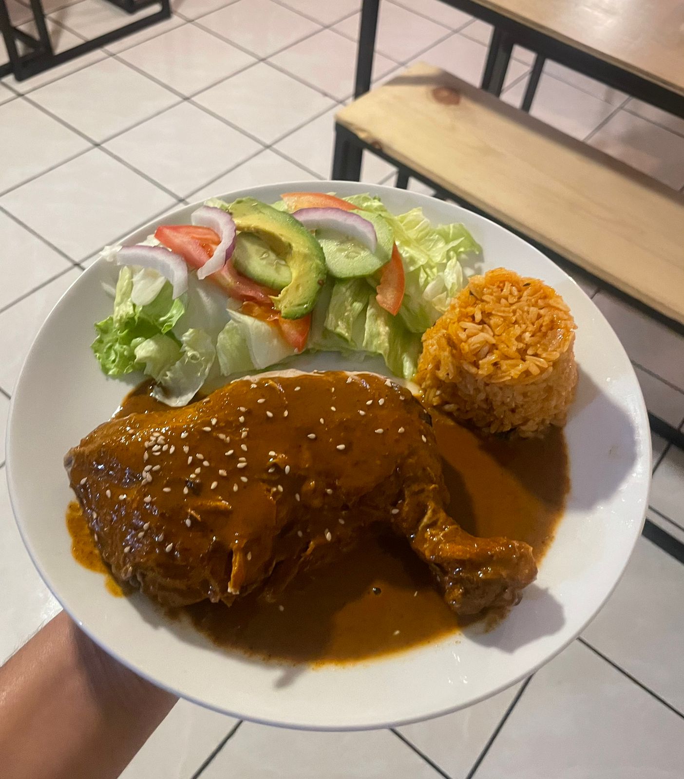 Mole de la casa, acompañado de arroz, frijol o ensalada.