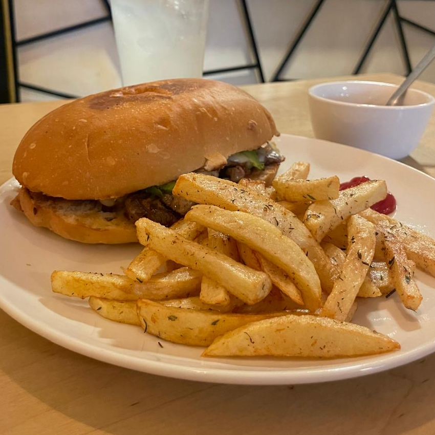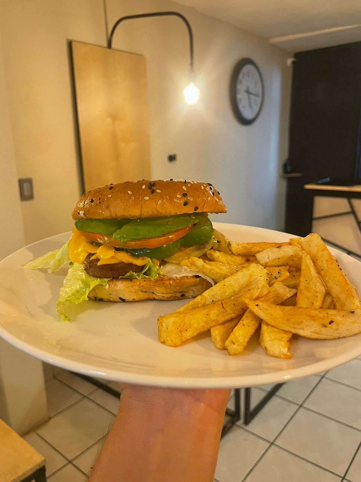 Hamburguesa jugosa servida con pan recién horneado, acompañada de papas fritas crujientes.