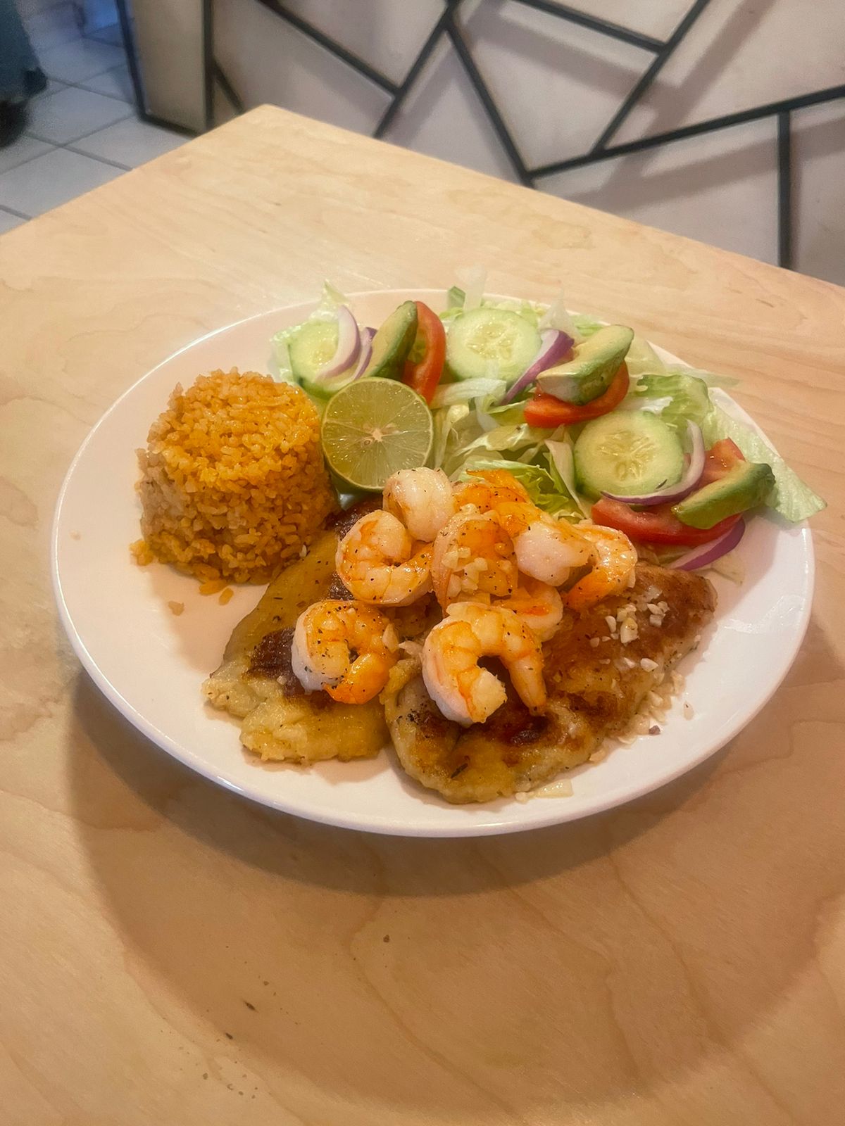 Filete de pescado a la plancha con 7 camarones, con salsa de la casa.