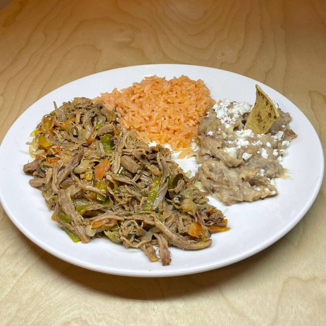 Bistec guisado con chile california, cebolla y tomate, perfumado con aires de cilantro acompañado con arroz y frijol, tortillas de maíz o harina.