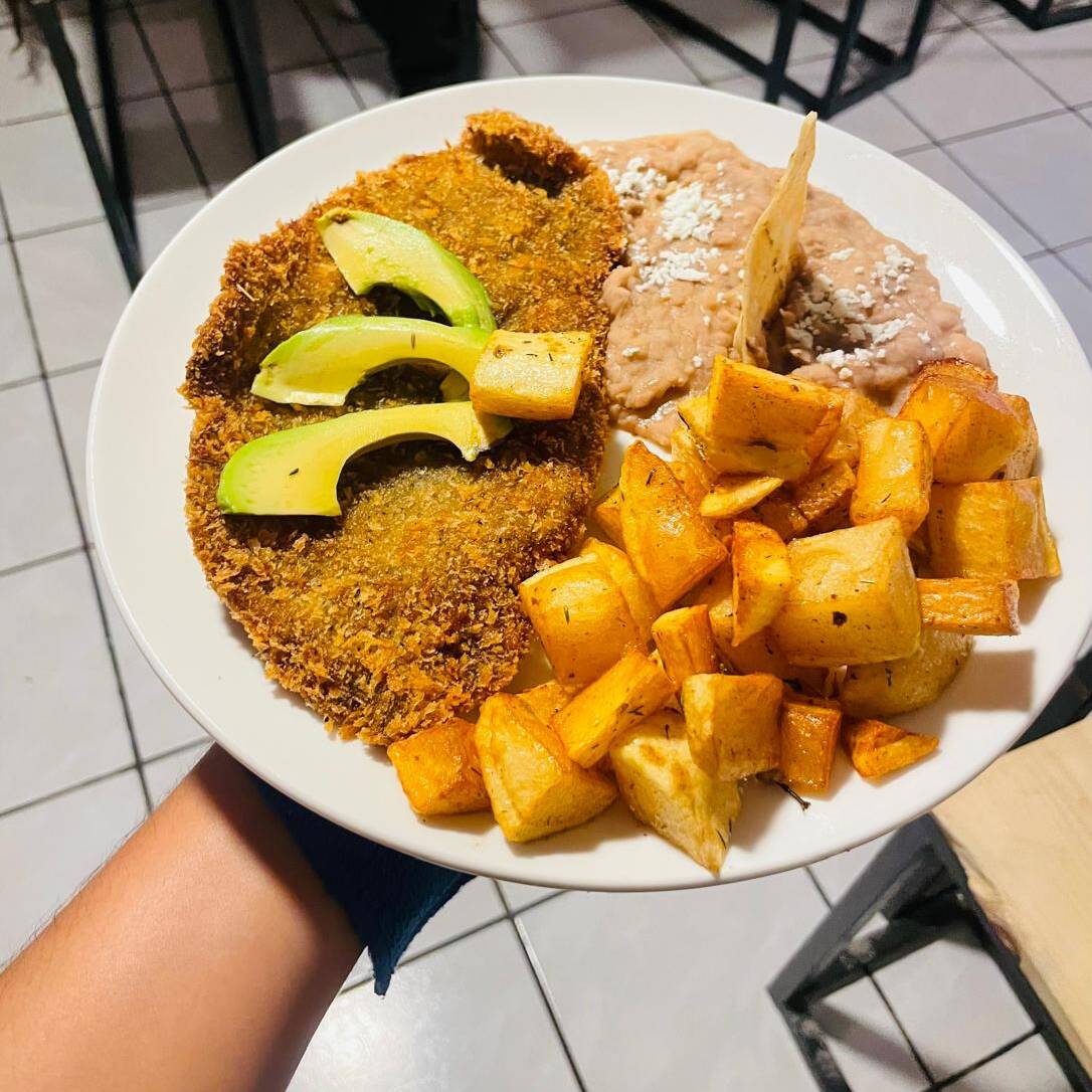 Acompañado con papas fritas, frijol, ensalada o arroz (solo dos guarniciones) tortillas de maíz o harina.