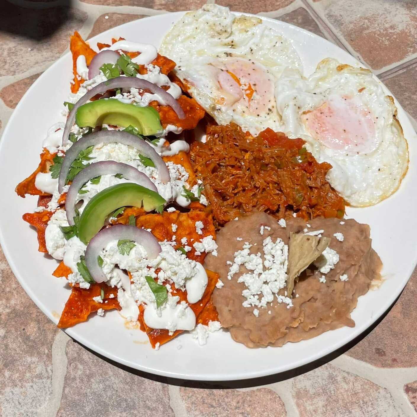 Chilaquiles acompañados de carne de machaca, una combinación perfecta de sabores.