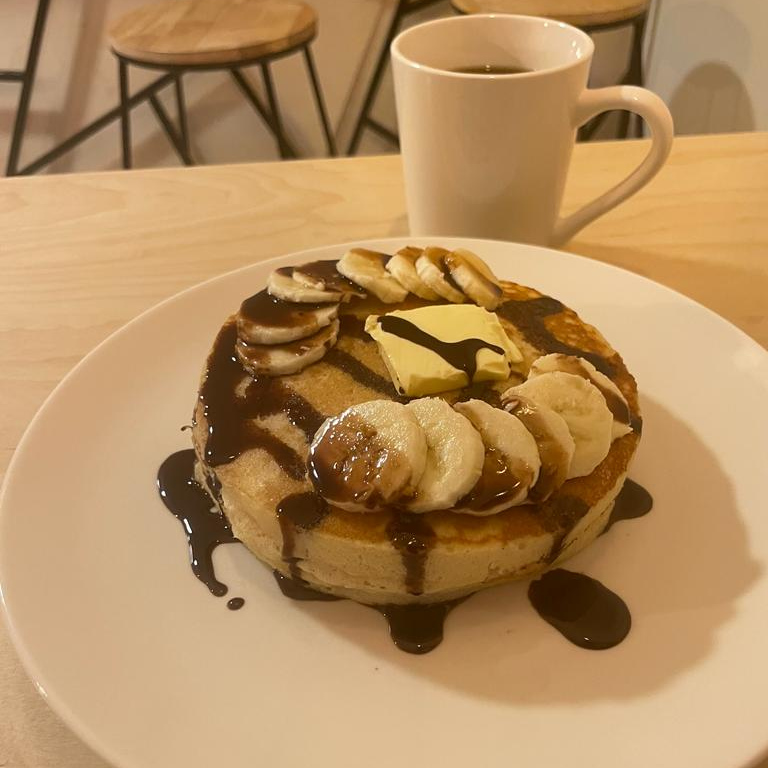 Hot cakes esponjosos bañados en Nutella, ideales para los amantes del chocolate.