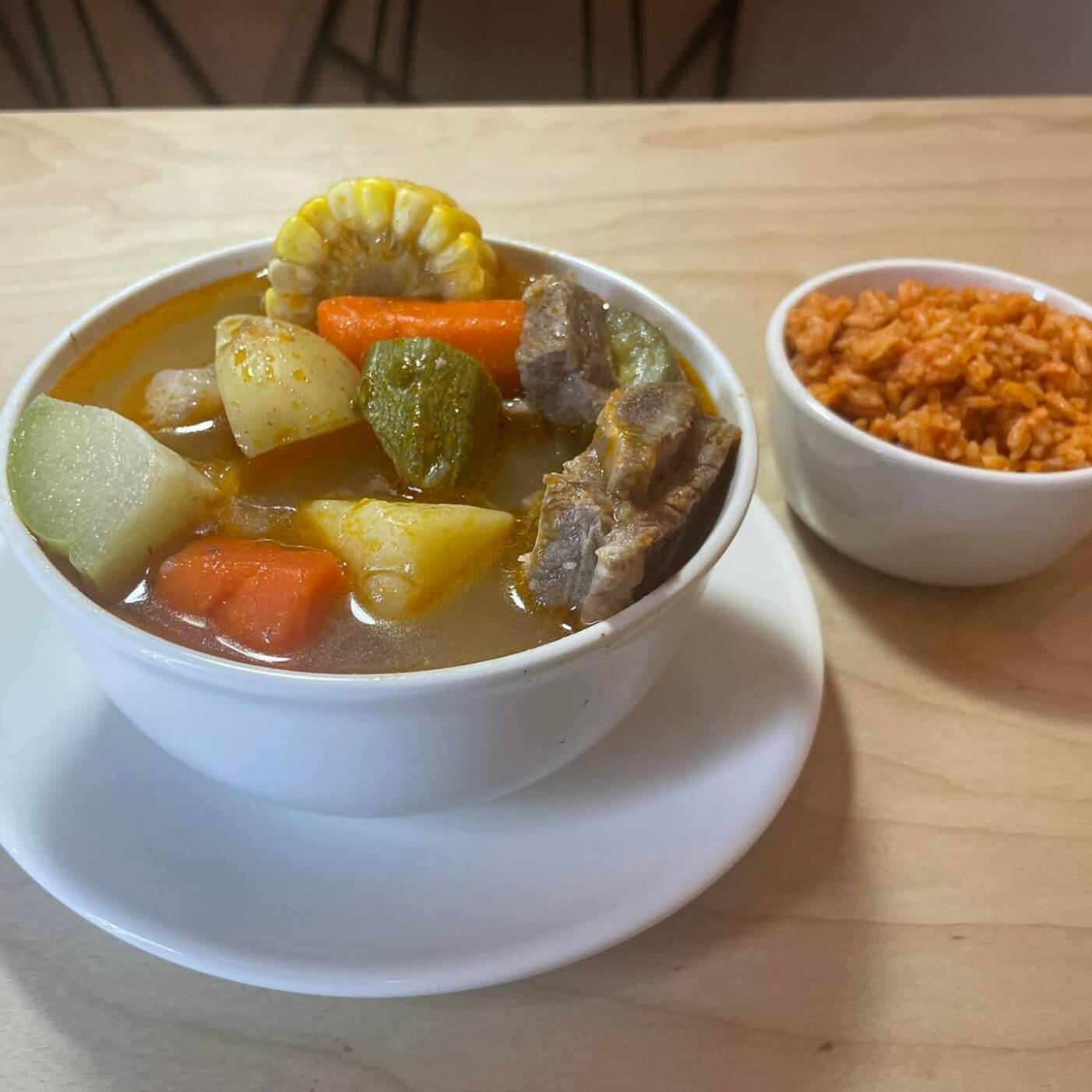 Con chile california, cebolla y tomate, perfumada con aires de cilantro, acompañado con arroz y frijol, tortillas de maíz o harina.