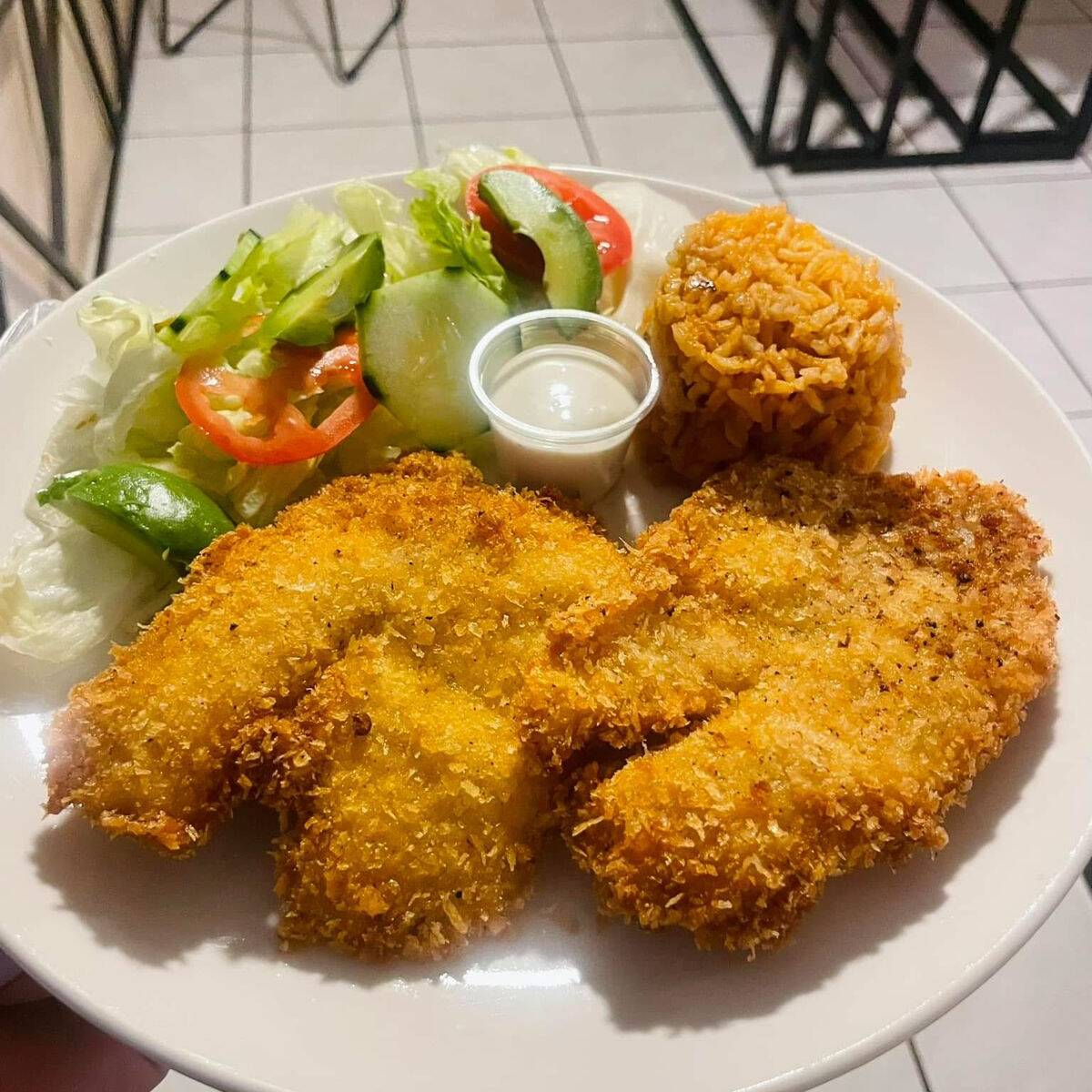 Suprema de pollo sellada a la plancha, acompañada con ensalada y arroz, con tortillas de maíz o a la mantequilla.
