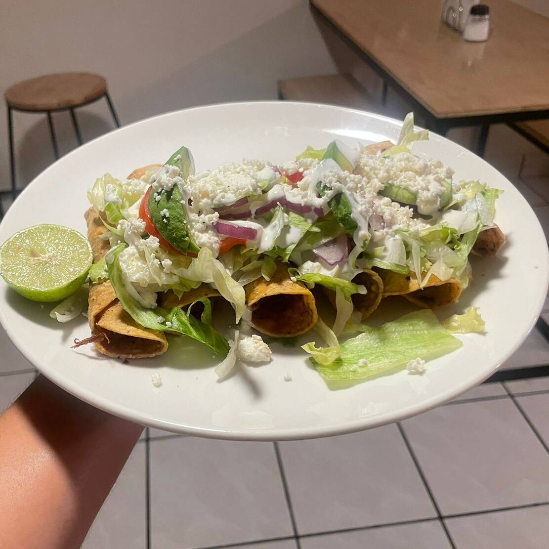 Orden de 6 piezas, flautas con carne deshebrada y papa bañadas en salsa de tomate, lechuga, tomate, cebolla, queso cotija y crema acompañadas de consomé.
