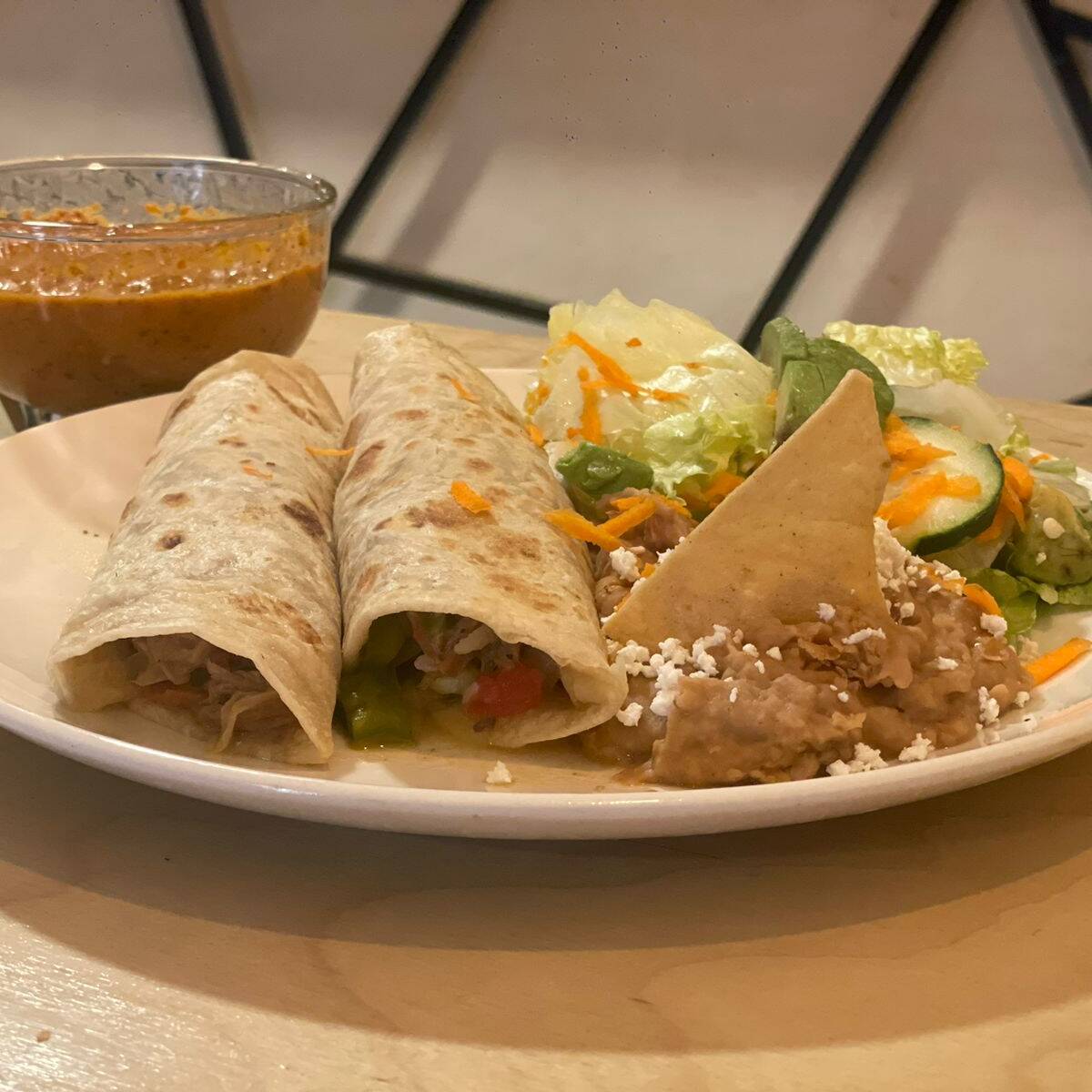 Orden de 2 piezas, tortilla de harina rellena de frijoles refritos y queso monterrey, y machaca, encima lechuga, tomate, cebolla, queso cotija y crema.