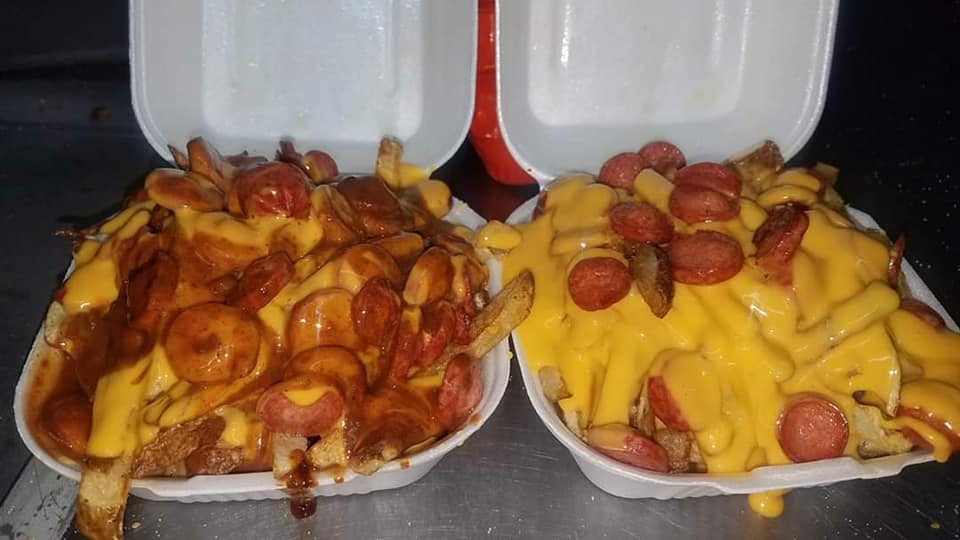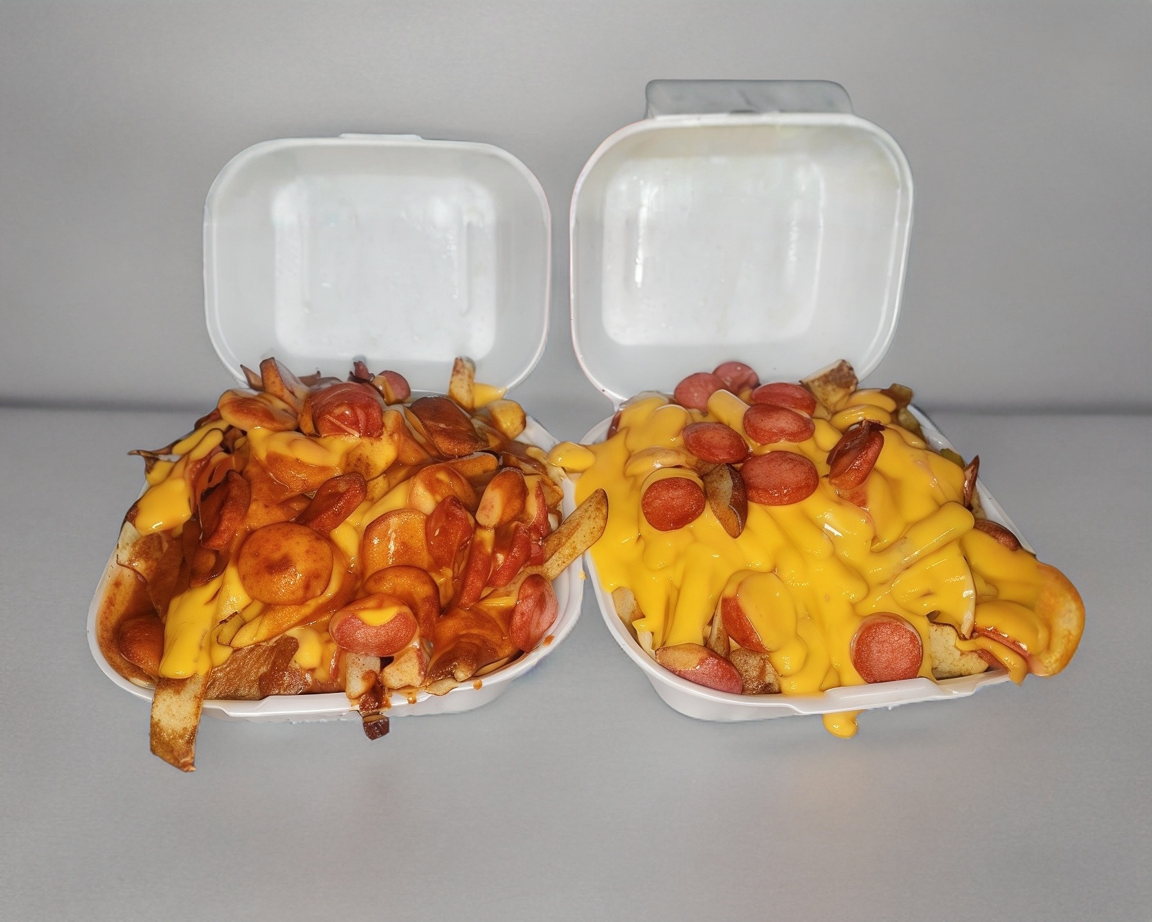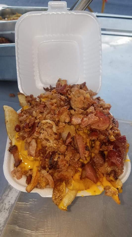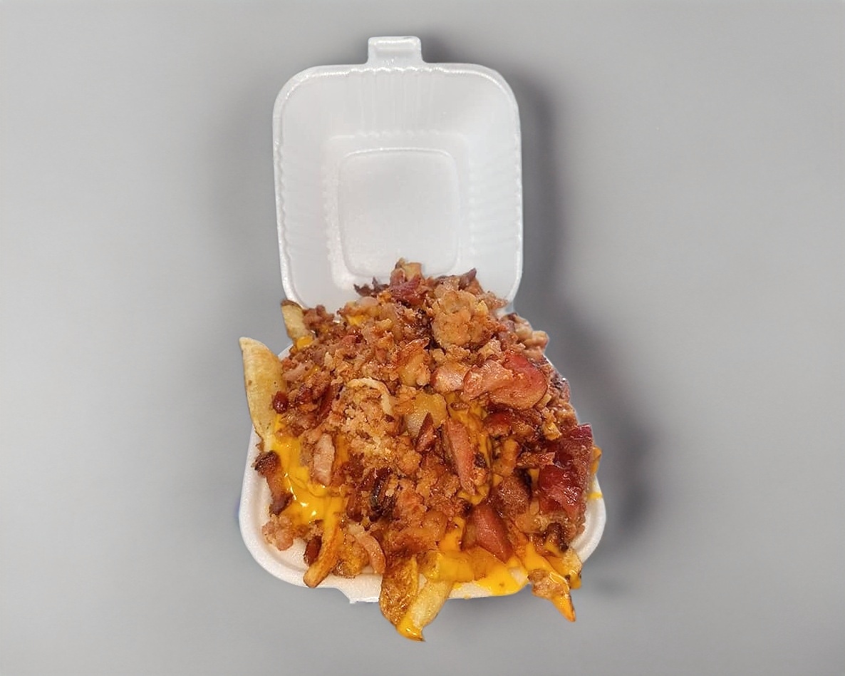 Papas, queso, chilli bean, tocino, cebolla y champiñones a la plancha.